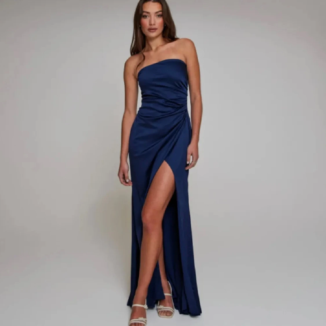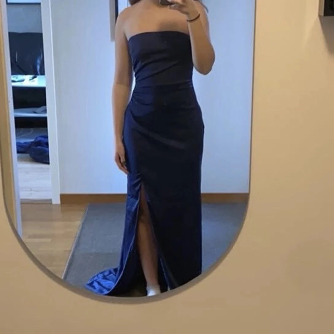 Supersnygg marinblå balklänning med slits från nelly i storleken 32, passar även 34, kostar 799kr på hemsidan. Jag har sytt upp den så den passar mig, är ca 165 med klackar, men den går att fälla ned igen. Annars inga defekter, skriv för fler bilder 💞