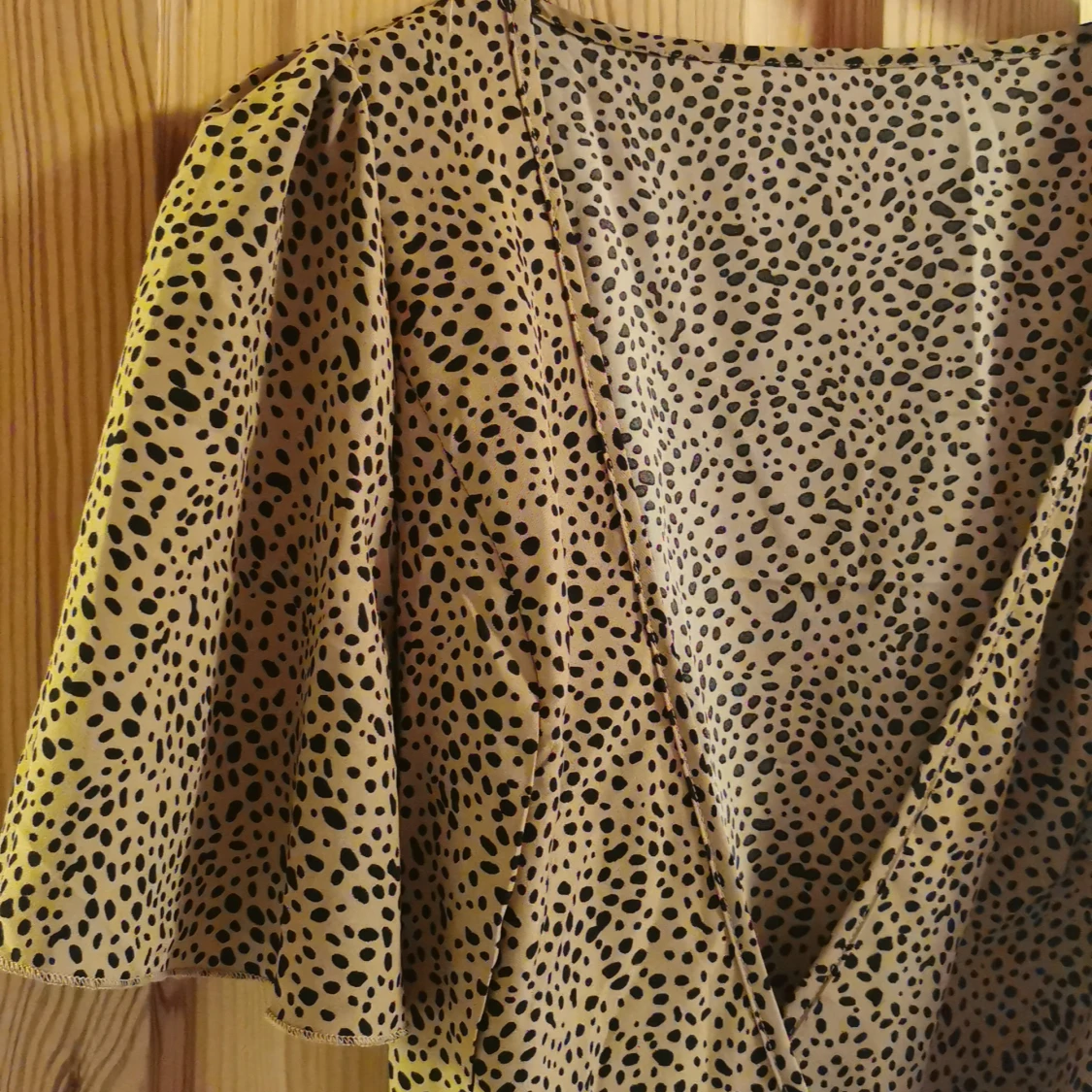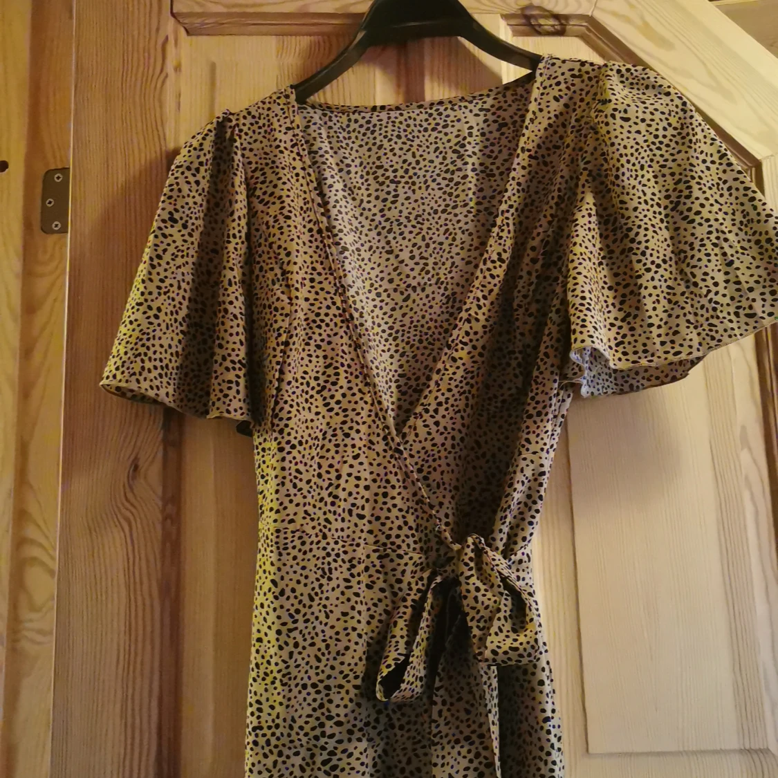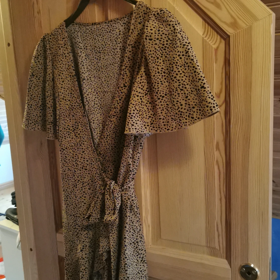 Beige/brun klänning med svarta prickar. Helt oanvänd. Nysick. Sitter som en S/M men går att spänna i midjan.