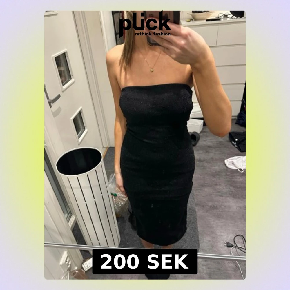 Säljer en svart, glittrig axelbandslös klänning i tight modell. Klänningen är midilång och har en snygg slits bak för extra rörelsefrihet. Perfekt för dig som vill sticka ut med en elegant och stilren look.