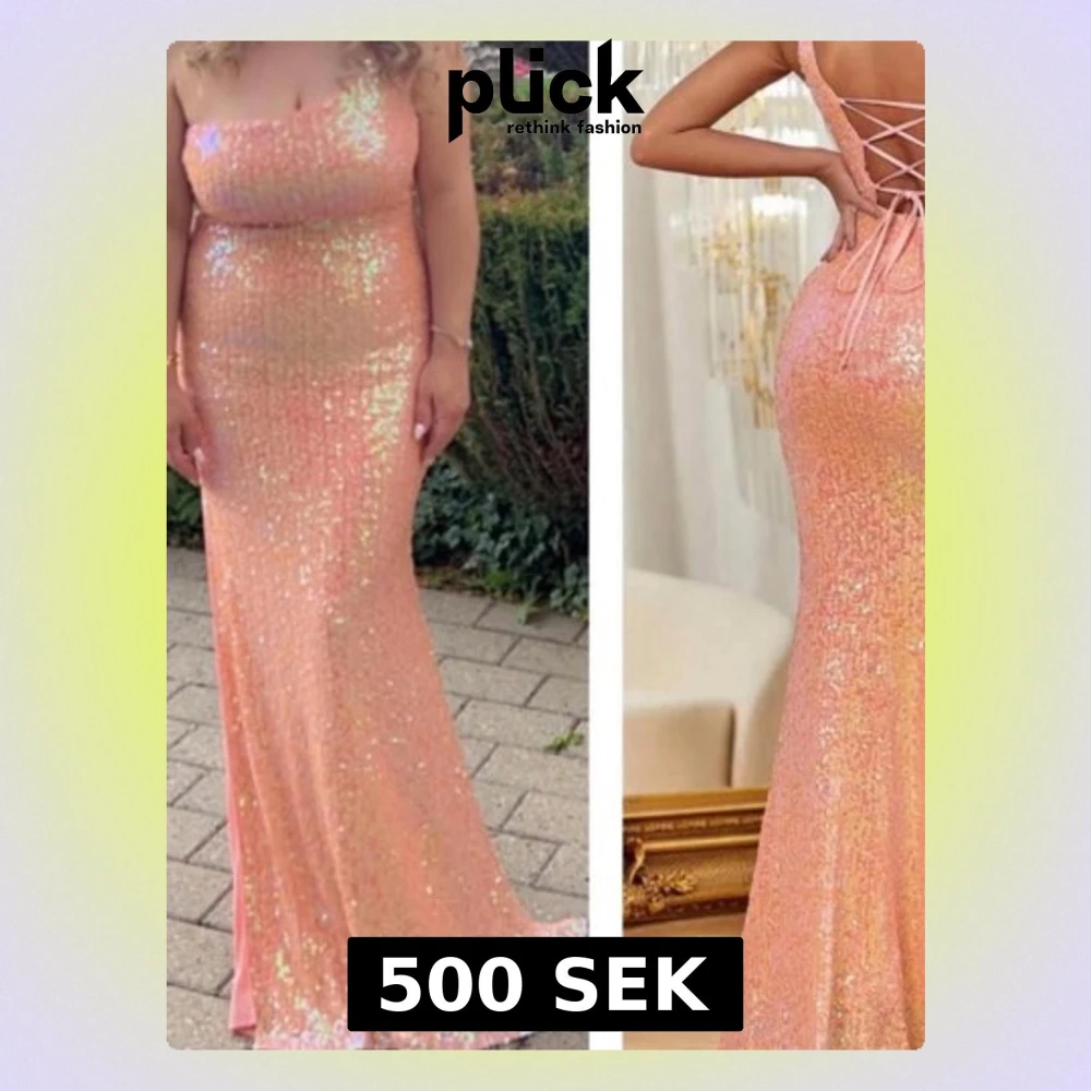 Säljer en superfin glittrig långklänning i peach med paljetter. Klänningen har axelbandslös design framtill och snörning i ryggen för snygg passform. Perfekt för bal eller fest och ger en riktigt glam känsla. M-L💕