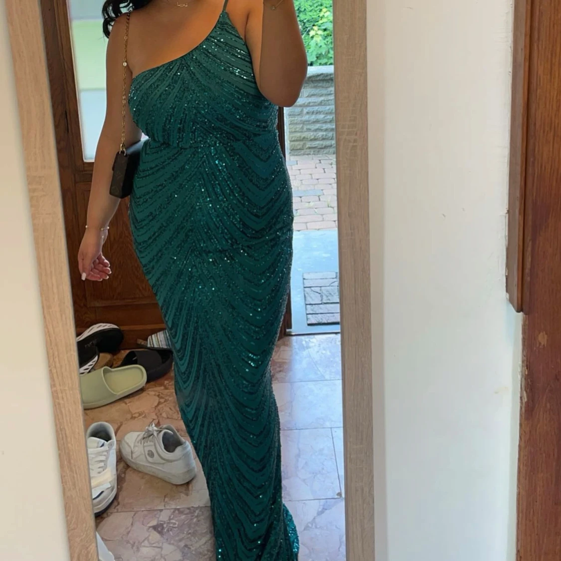 Säljer denna gröna festklänning med paljetter, den är använd ett tillfälle i några timmar så den är i princip som ny.