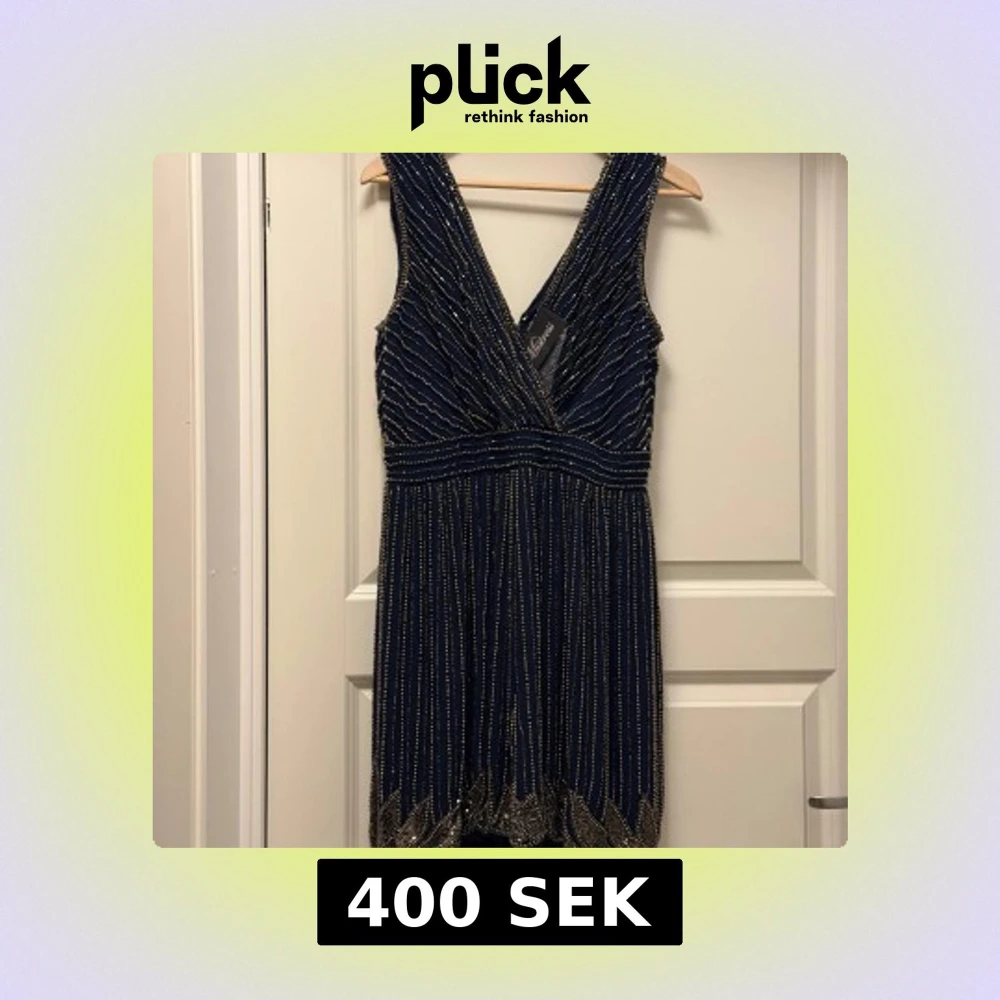 Snygg mörkblå klänning med glittriga detaljer och v-ringad design. Klänningen har ett elegant mönster av glittrande linjer och en vacker kantdetalj längst ner. Perfekt för en festlig kväll! 💃✨