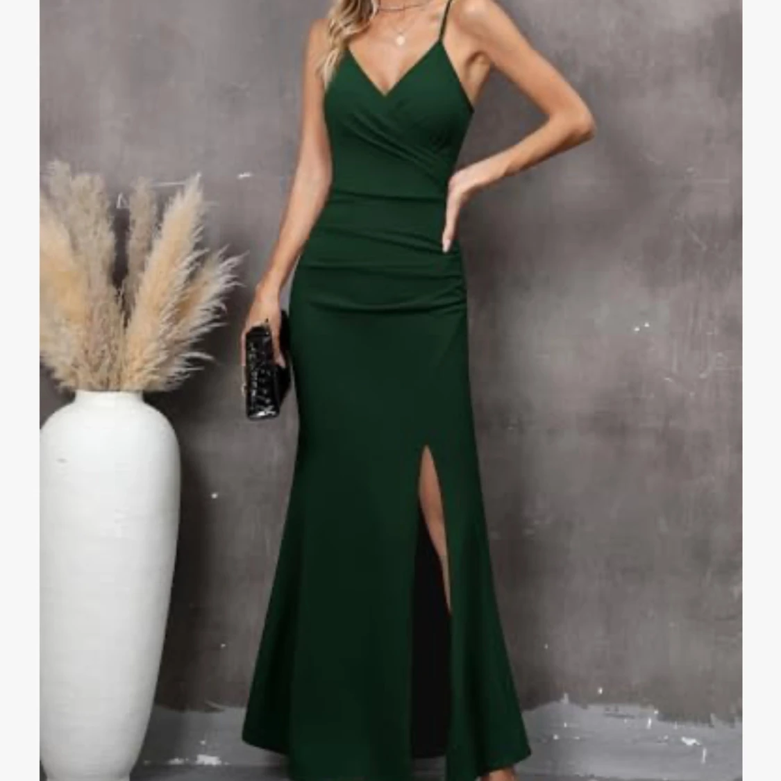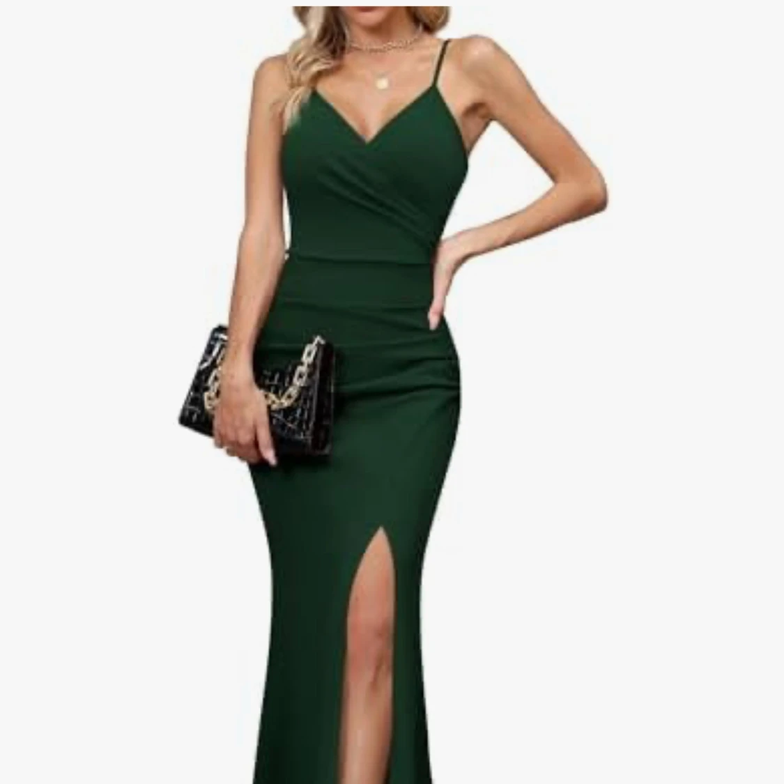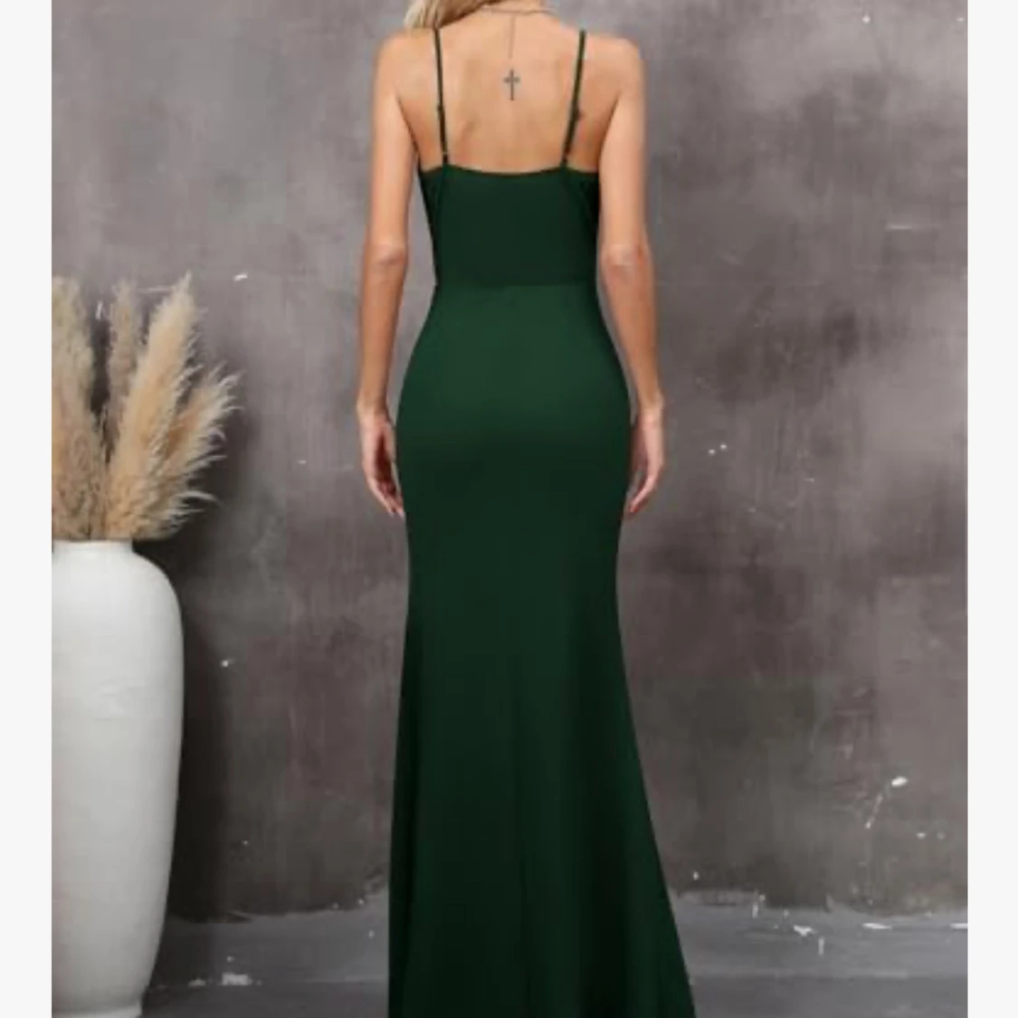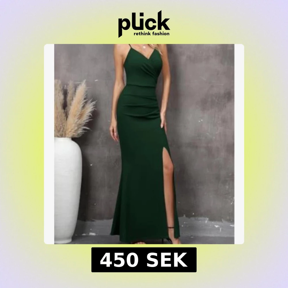 Supersnygg mörkgrön långklänning med smala axelband och v-ringad omlott-topp. Klänningen har en figurnära passform upptill och en hög slits framtill som ger en extra cool touch. Perfekt för dig som vill sticka ut med en elegant och stilren look. Klänningen är oanvänd och har prislapp kvar.
