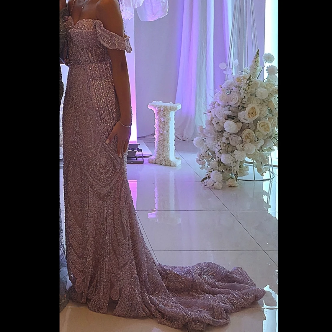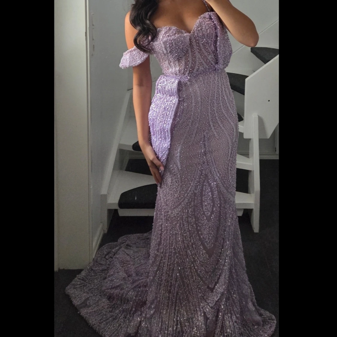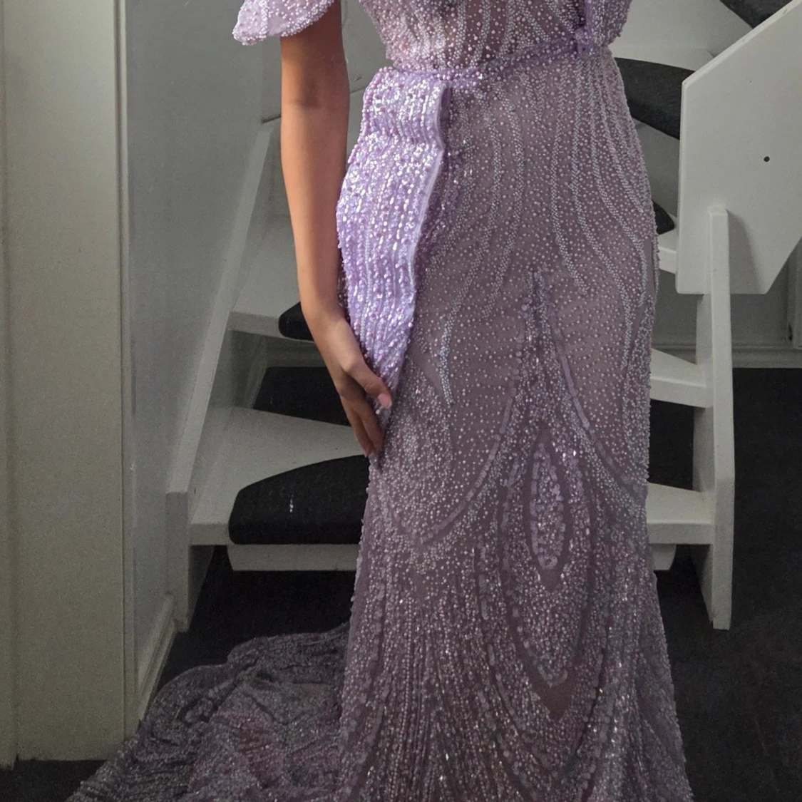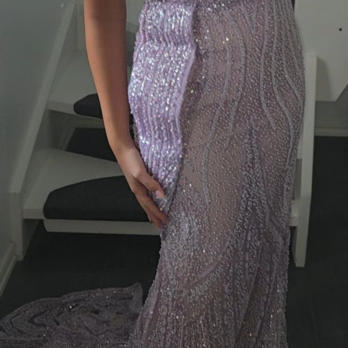 Magisk ljuslila långklänning med glittriga paljetter och pärlor över hela tyget. Klänningen har offshoulder-ärmar, figurnära passform och en vacker släp. Detaljerad mönsterdesign och romantisk känsla, perfekt för bal eller fest. Materialet är troligtvis polyester eller satin.