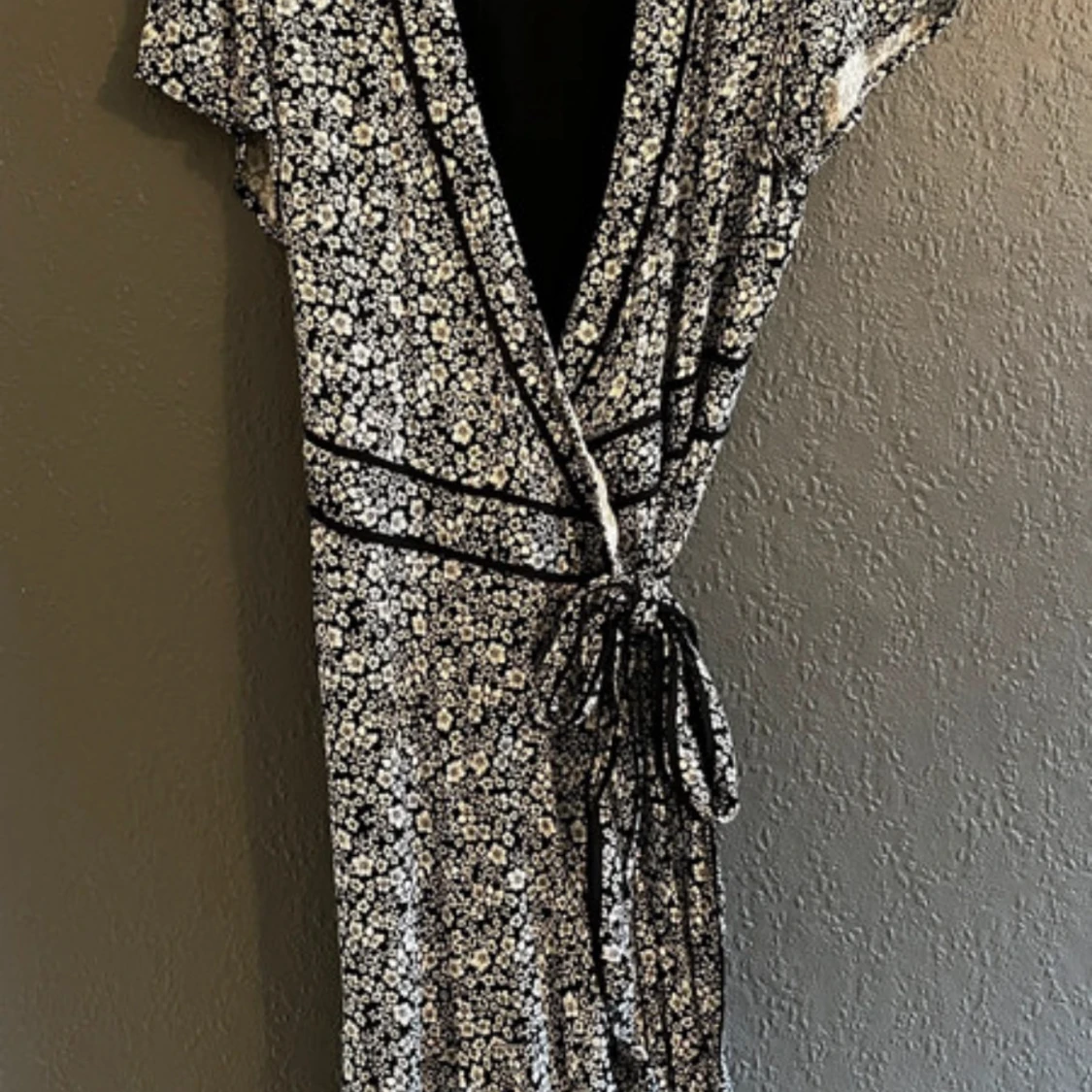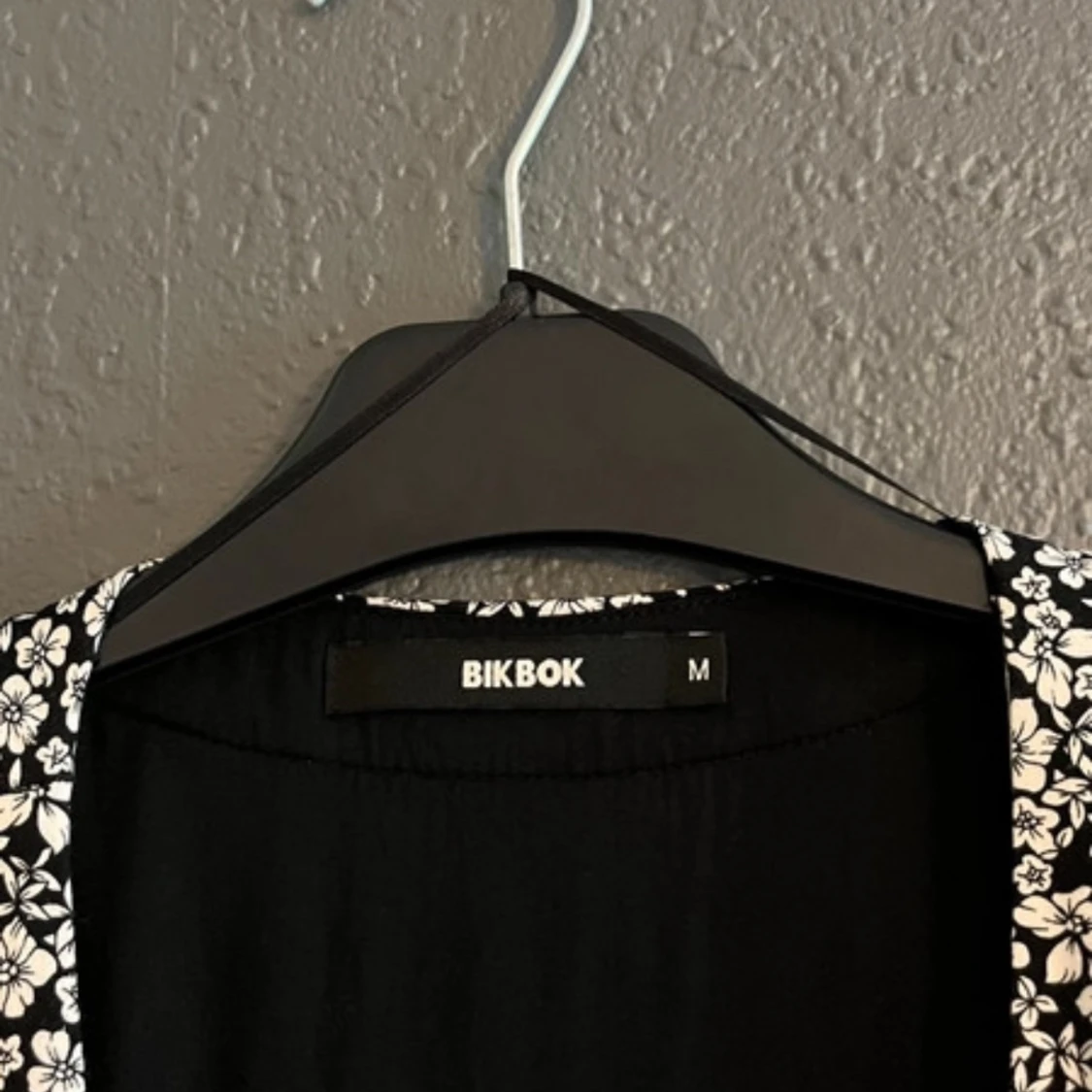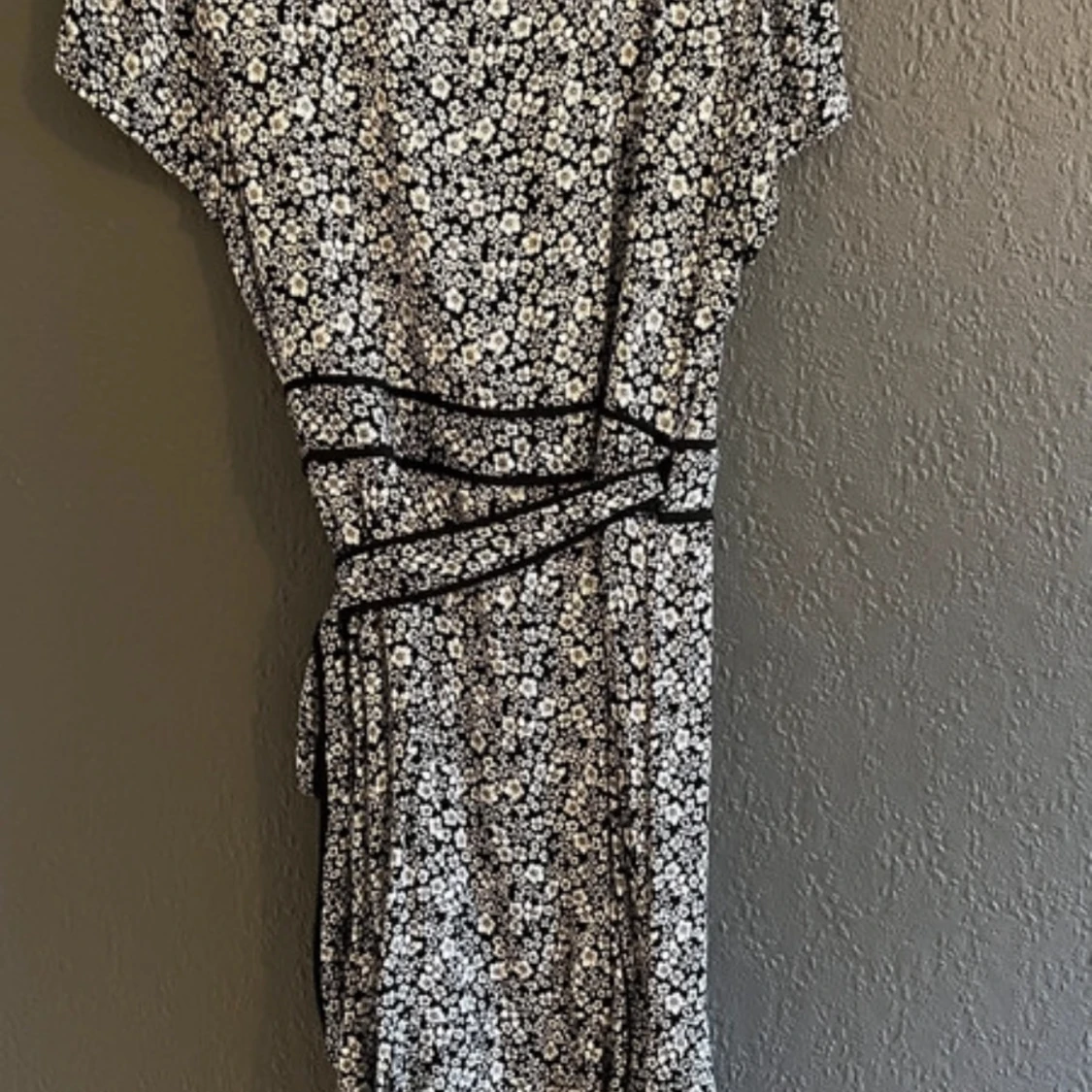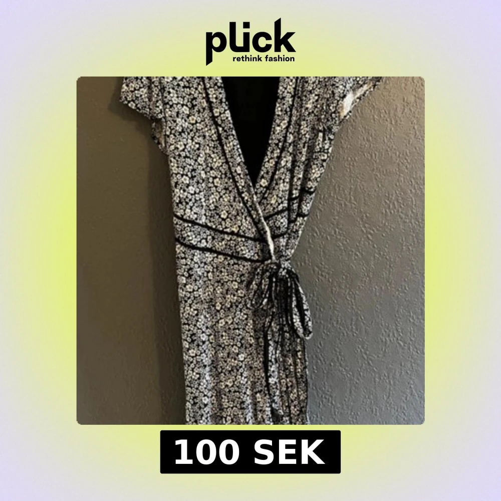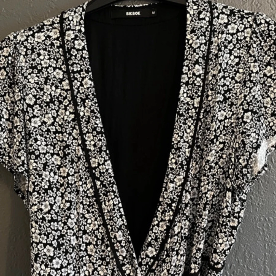 Säljer en svartvit blommig omlottklänning från BikBok med knyt i midjan och v-ringning. Klänningen har korta ärmar och ett fint blommönster över hela tyget. Perfekt för dig som gillar en feminin och avslappnad stil.