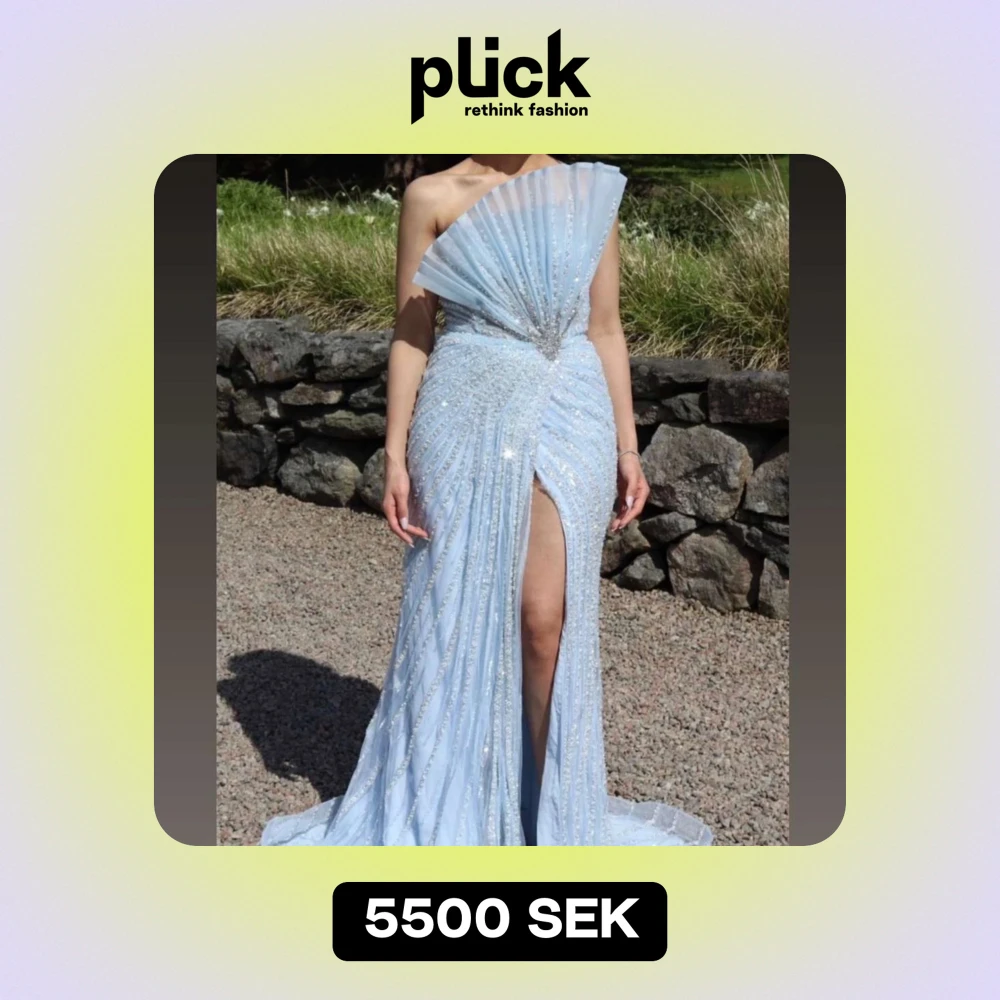 Säljer en jättefräsch ljusblå lång klänning med glittriga detaljer och en elegant slits. Klänningen är från catwalk och har endast används en kväll. Den kan användas till bal/bröllop/förlovning. Nypris 7000. Mitt pris 5500