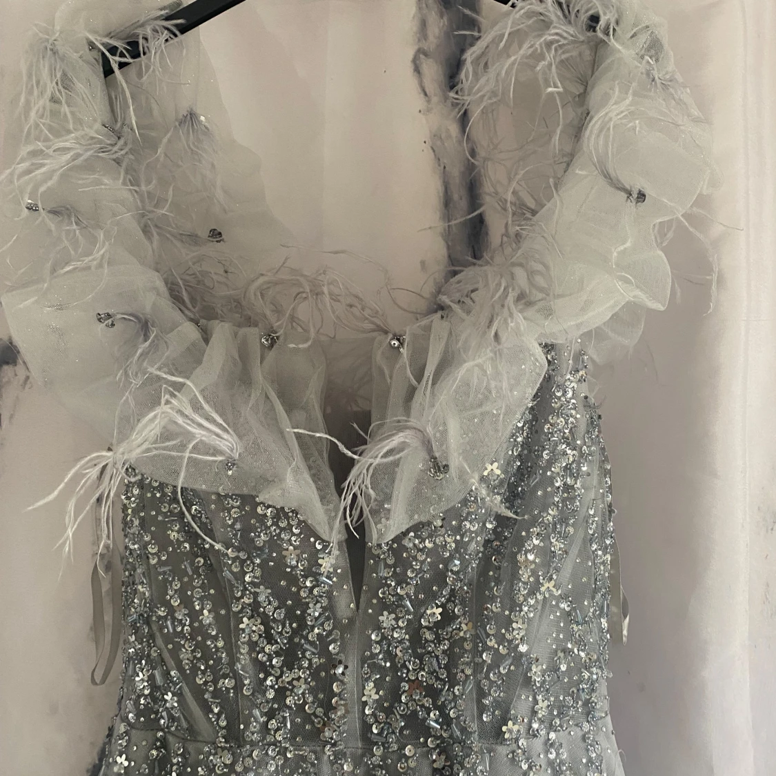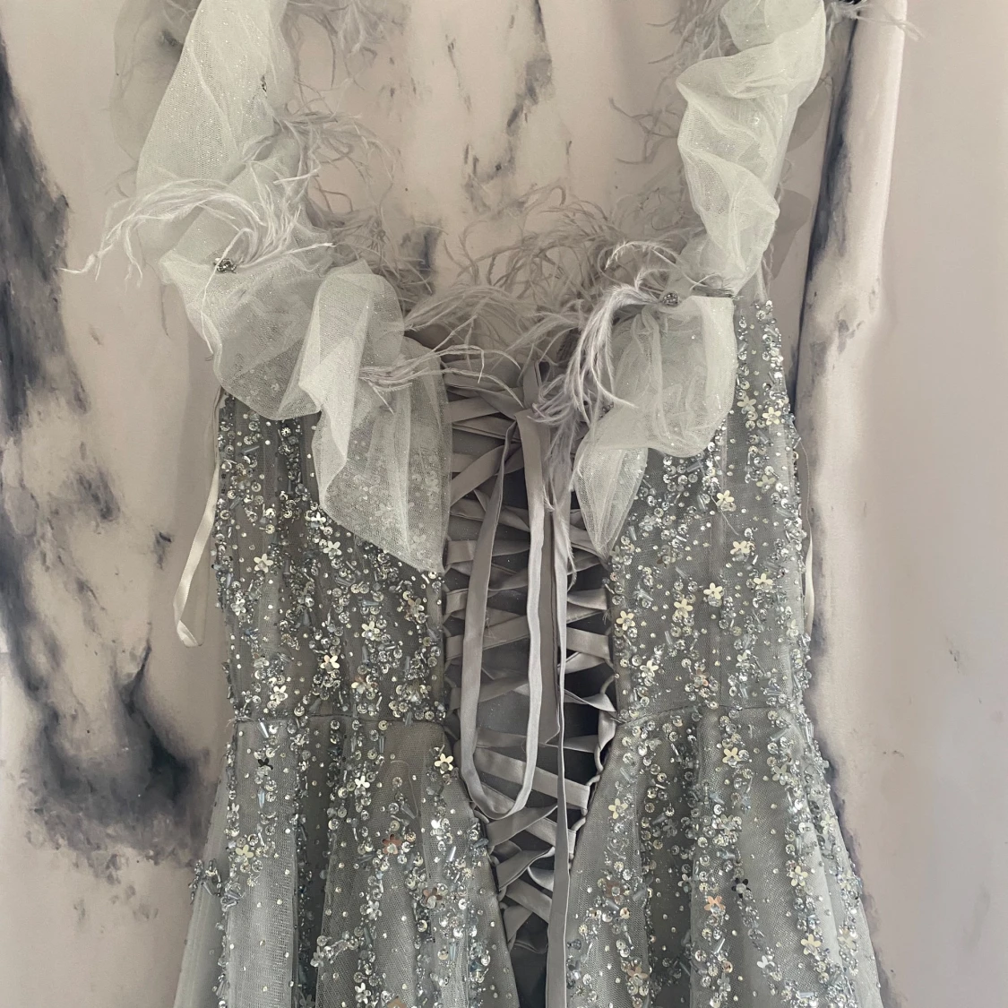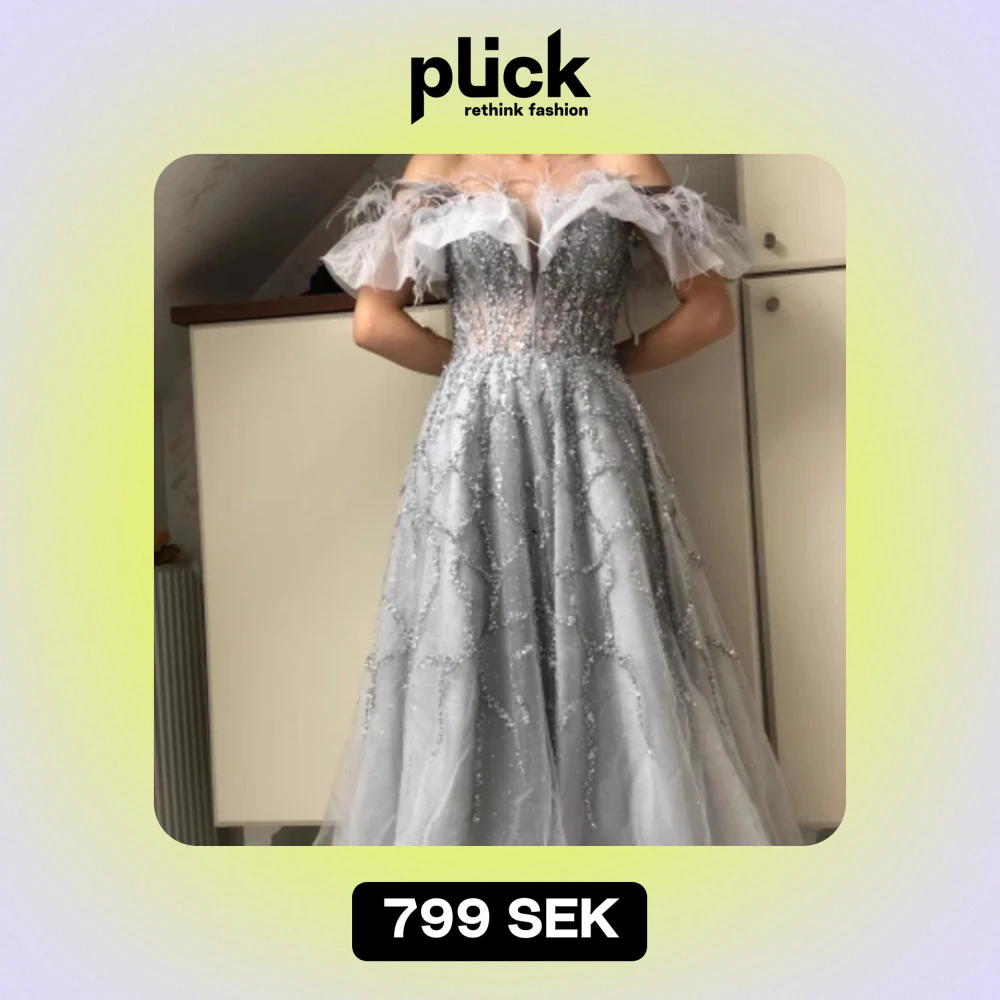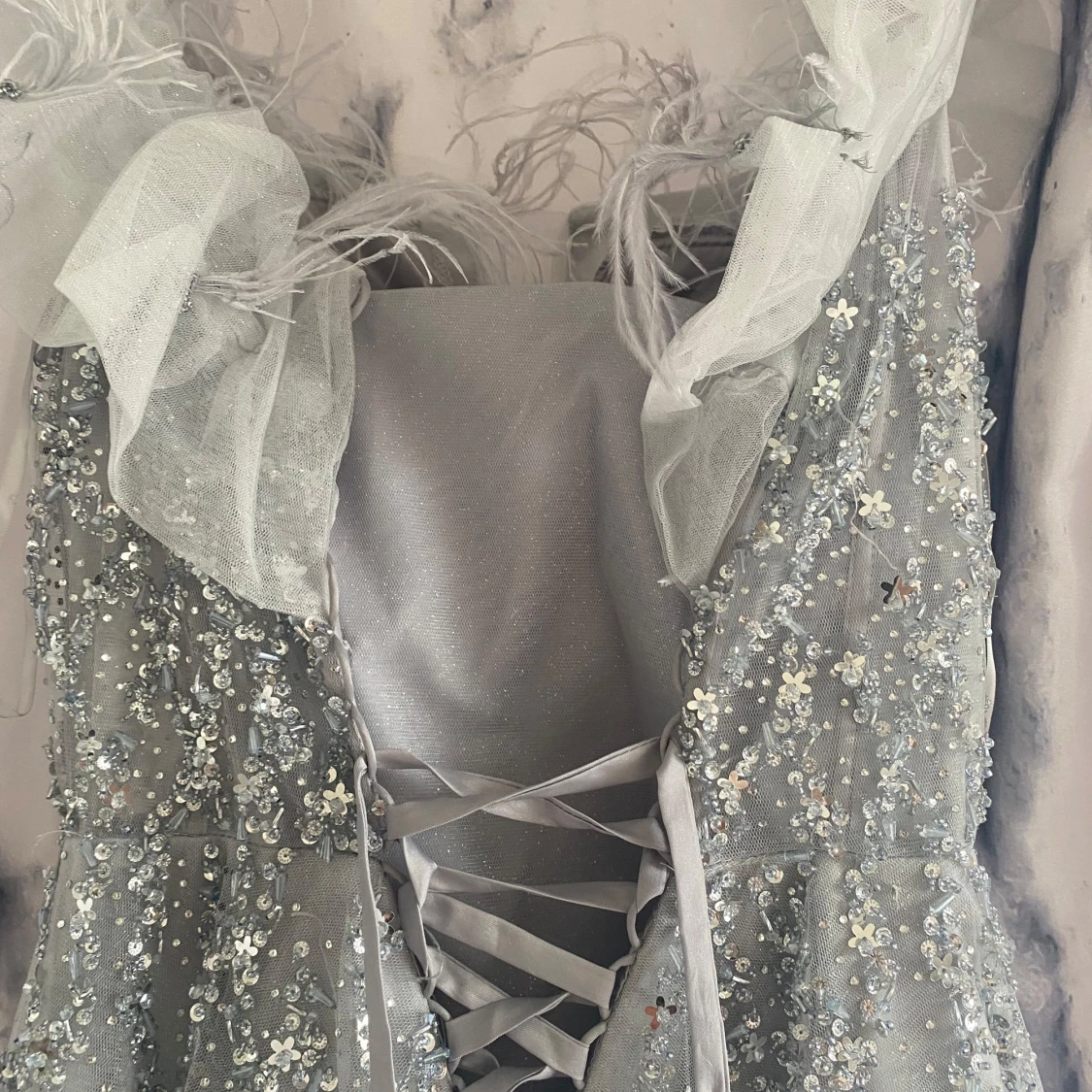 Jättefin grå festklänning som ger prinsessa känsla. Använd vara en gång. Du kan justera storleken själv.