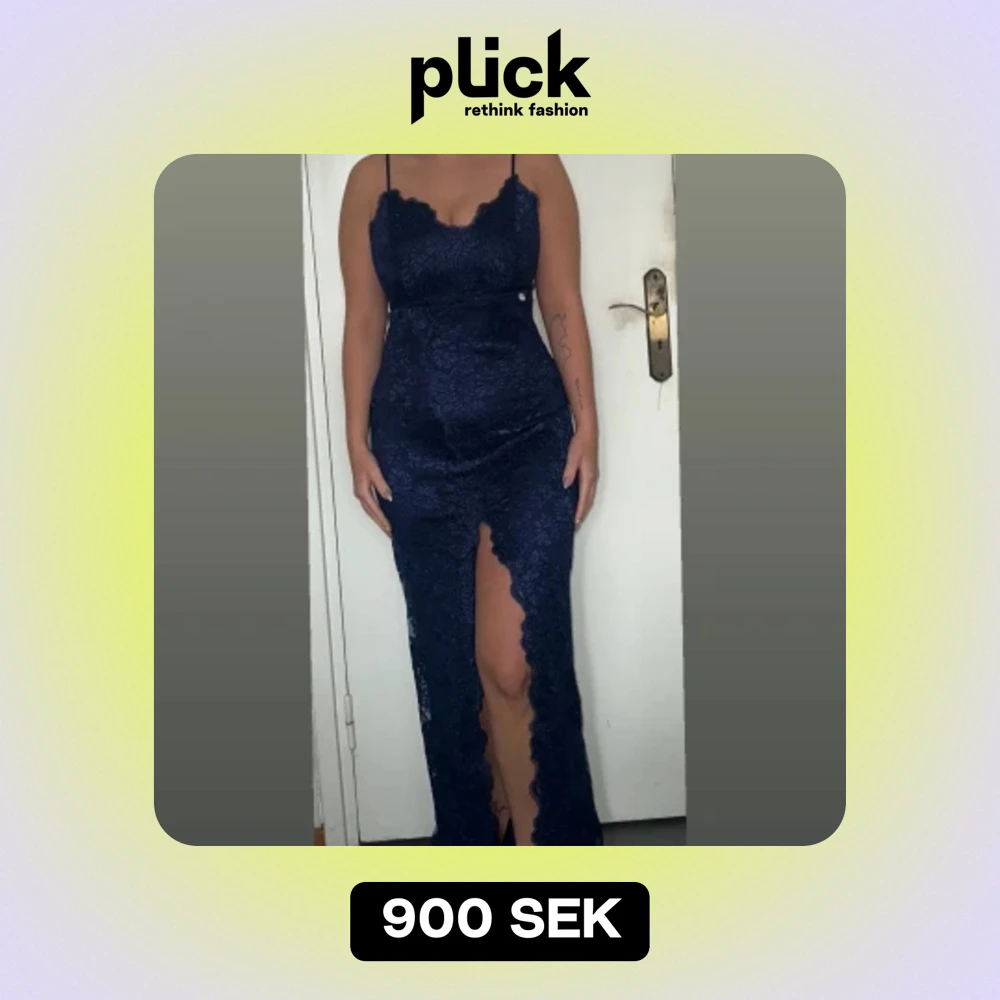 Säljer en elegant mörkblå långklänning i spets. Klänningen har smala axelband och en vacker slits framtill som ger en sofistikerad look. Perfekt för festliga tillfällen!
