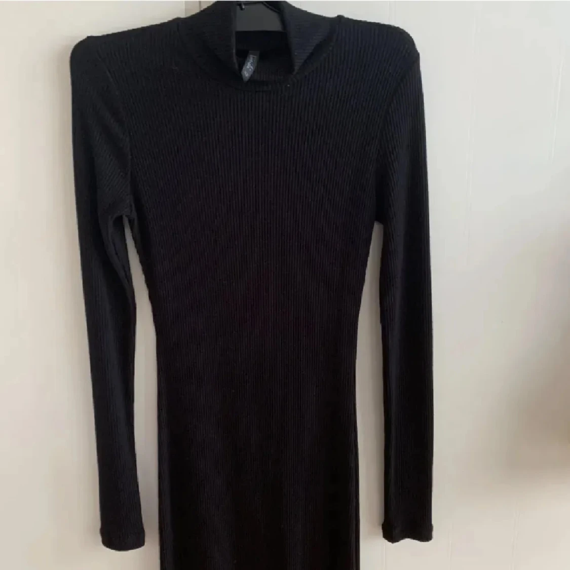 Säljer en svart, ribbad & figurnära klänning med långa ärmar och hög hals. Jättestretchigt skönt material så passar mig som i normala fall är en S/M. Använd endast 1 gång, oklart var den kommer ifrån kanske Nelly??