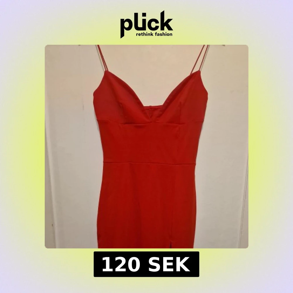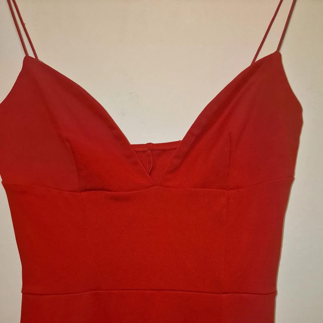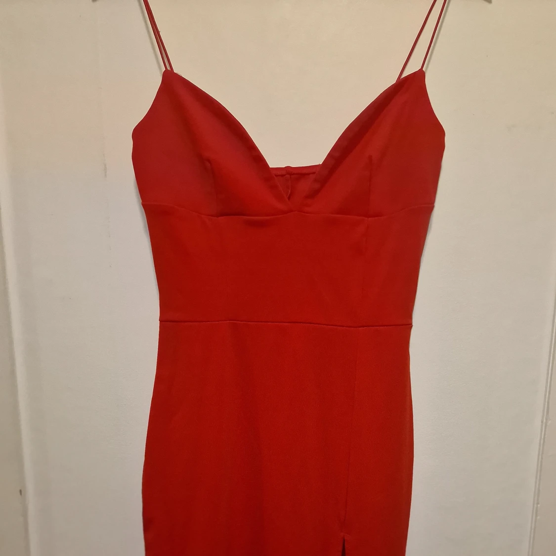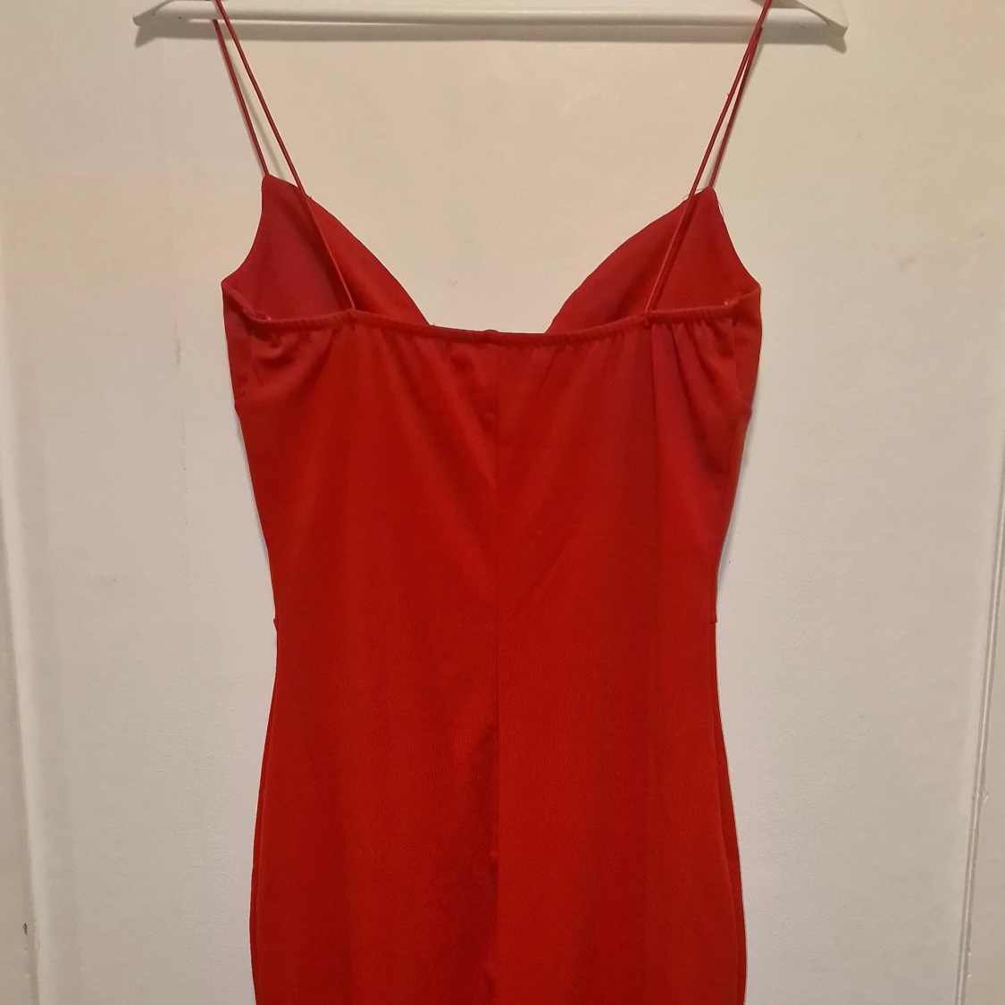 Snygg röd klänning med smala axelband och v-ringad urringning. Modellen är figurnära och har en slits framtill för extra edge. Tvättad vid flytt och märket fastnade med bikinisnören så fick klippa bort det. Se sista bilden. Aldrig använd.