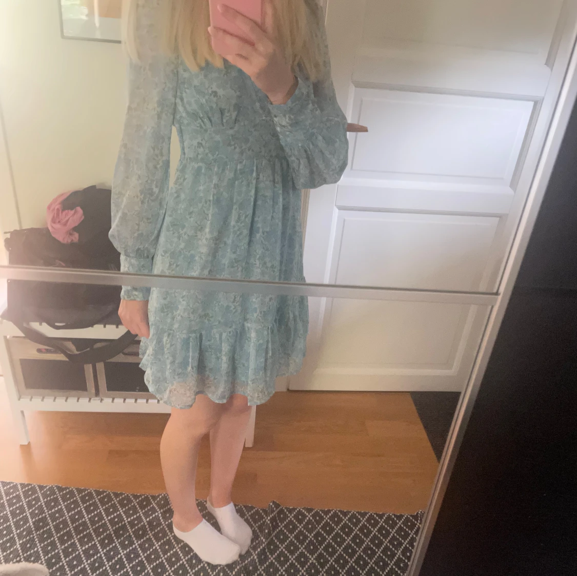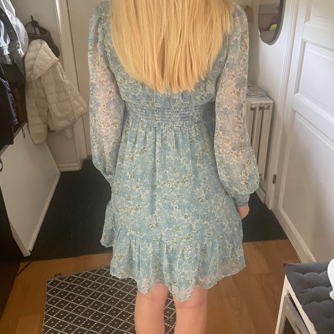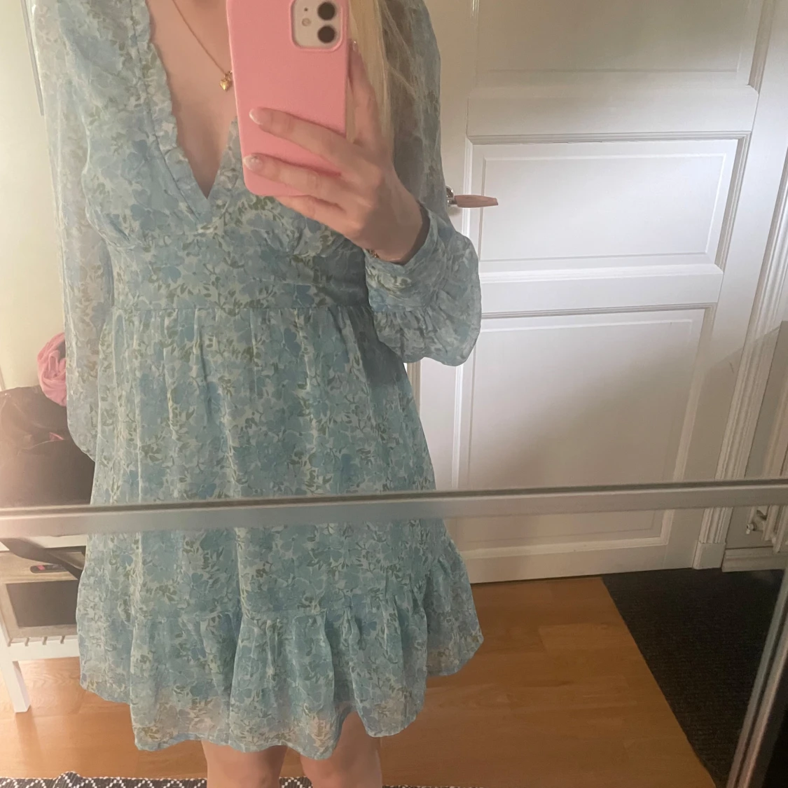 Supersöt ljusblå kortklänning med blommigt mönster och v-ringning. Klänningen har långa, transparenta ärmar och volangkant nertill. Har endast använt denna klänning en gång så den är i nyskick💗Pris kan diskuteras.