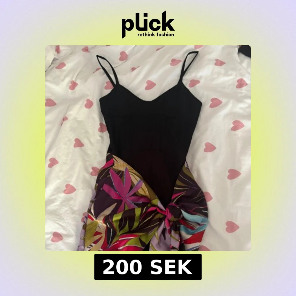 Säljer en svart klänning med smala axelband och figurnära överdel. Kjolen har ett färgglatt blommigt mönster i rosa, grönt, lila och rött samt en stor knytrosett framtill. Perfekt för dig som vill sticka ut med en unik look eller för fest. Endast använd en gång💕