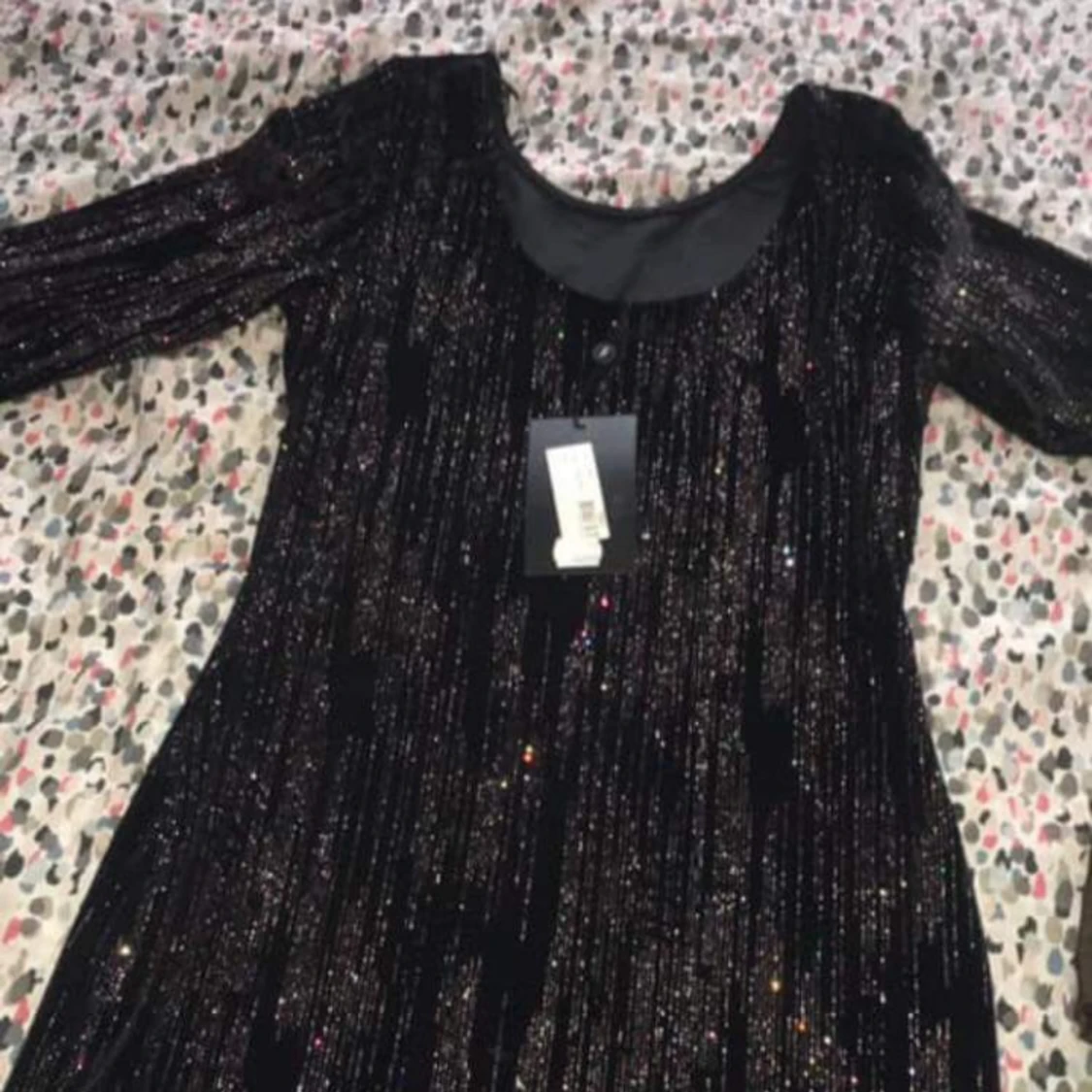 En jätte fin festkläning som är lånarmad med svart färg och glittrig köpte den för 500kr med säljer de för 250kr. Köparen står för frakt.