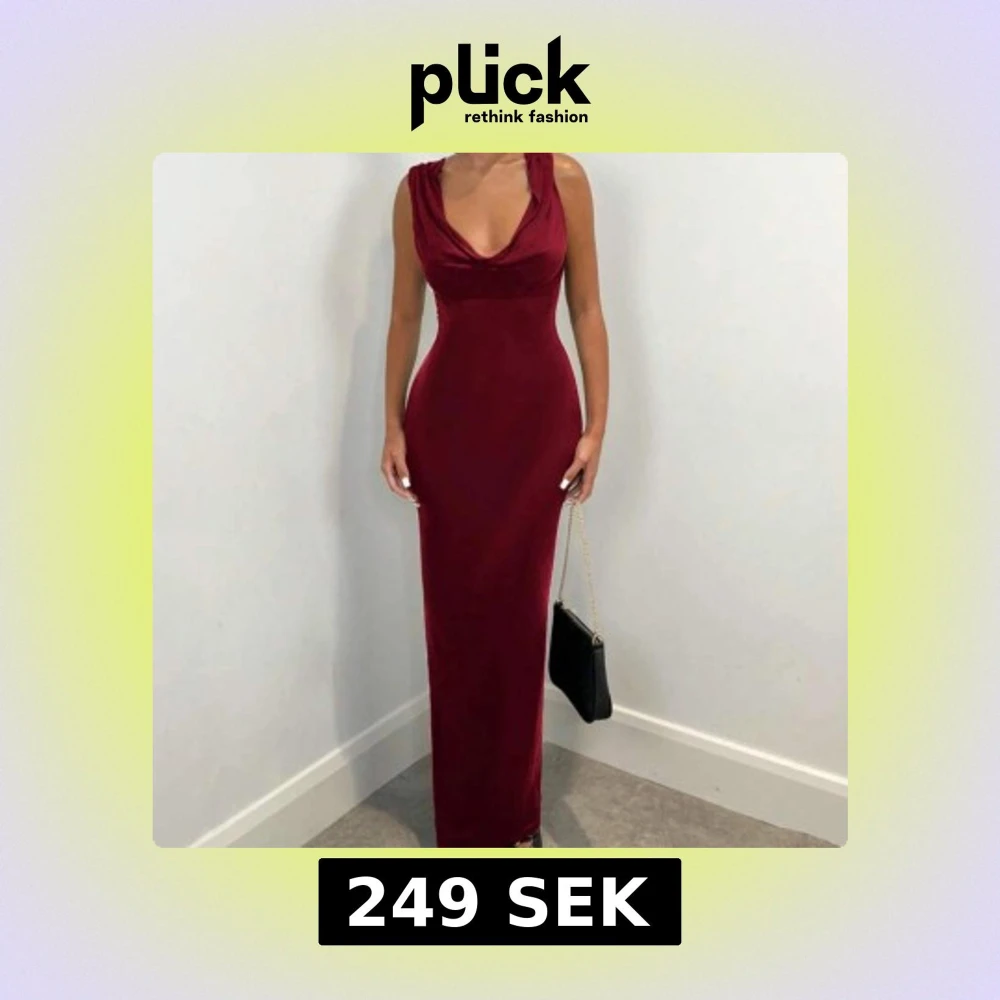 Elegant vinröd långklänning med djup v-ringning och öppen rygg. Klänningen har en tight passform som framhäver figuren och är perfekt för festliga tillfällen.