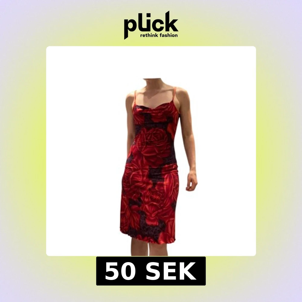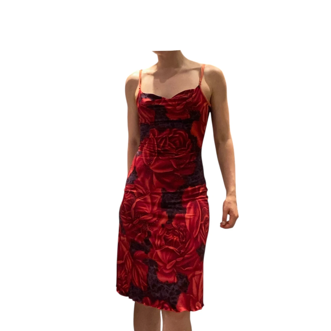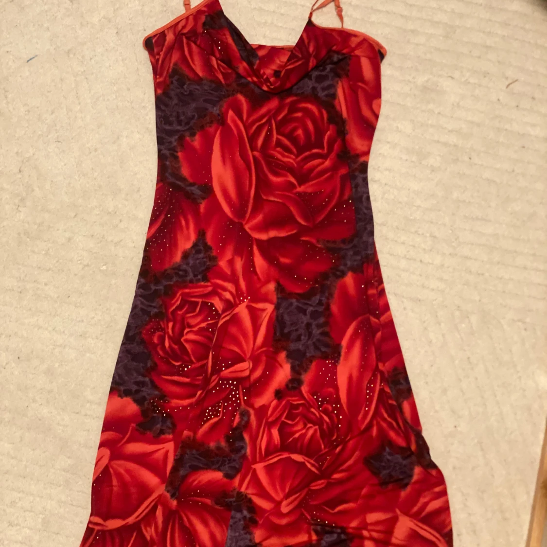 Röd kort klänning med stora rosor. Klänningen har justerbara smala axelband, paljetter som glittrar och en draperad halsringning (cow neck). Stretchigt material. Stork uppskattas till s/m