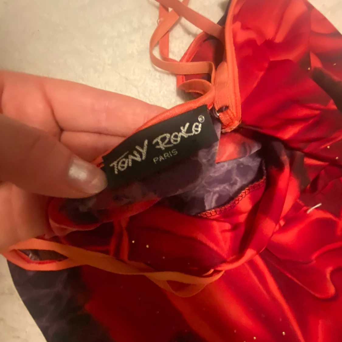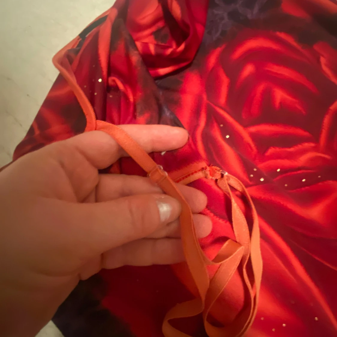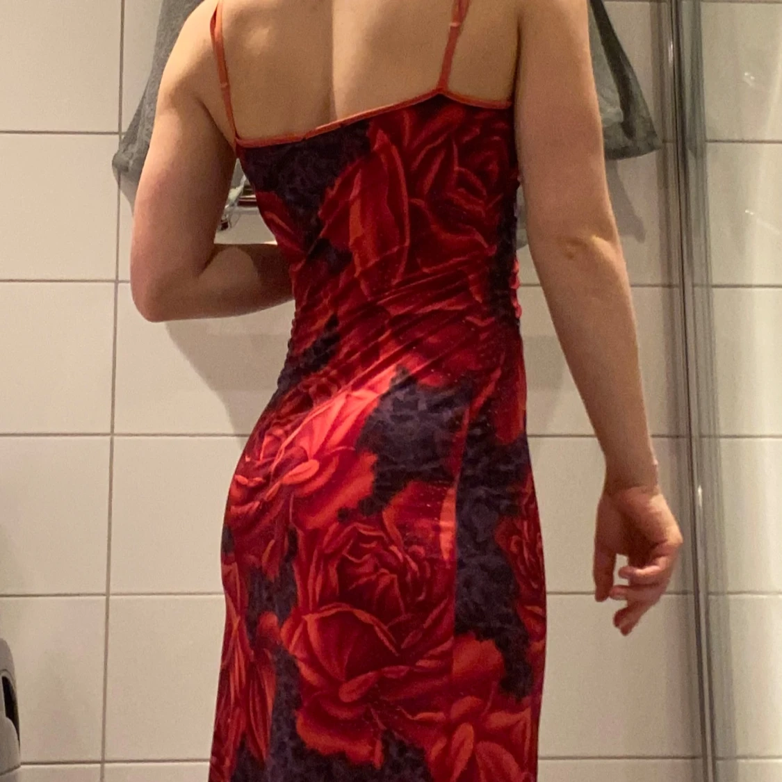 Röd kort klänning med stora rosor. Klänningen har justerbara smala axelband, paljetter som glittrar och en draperad halsringning (cow neck). Stretchigt material. Stork uppskattas till s/m
