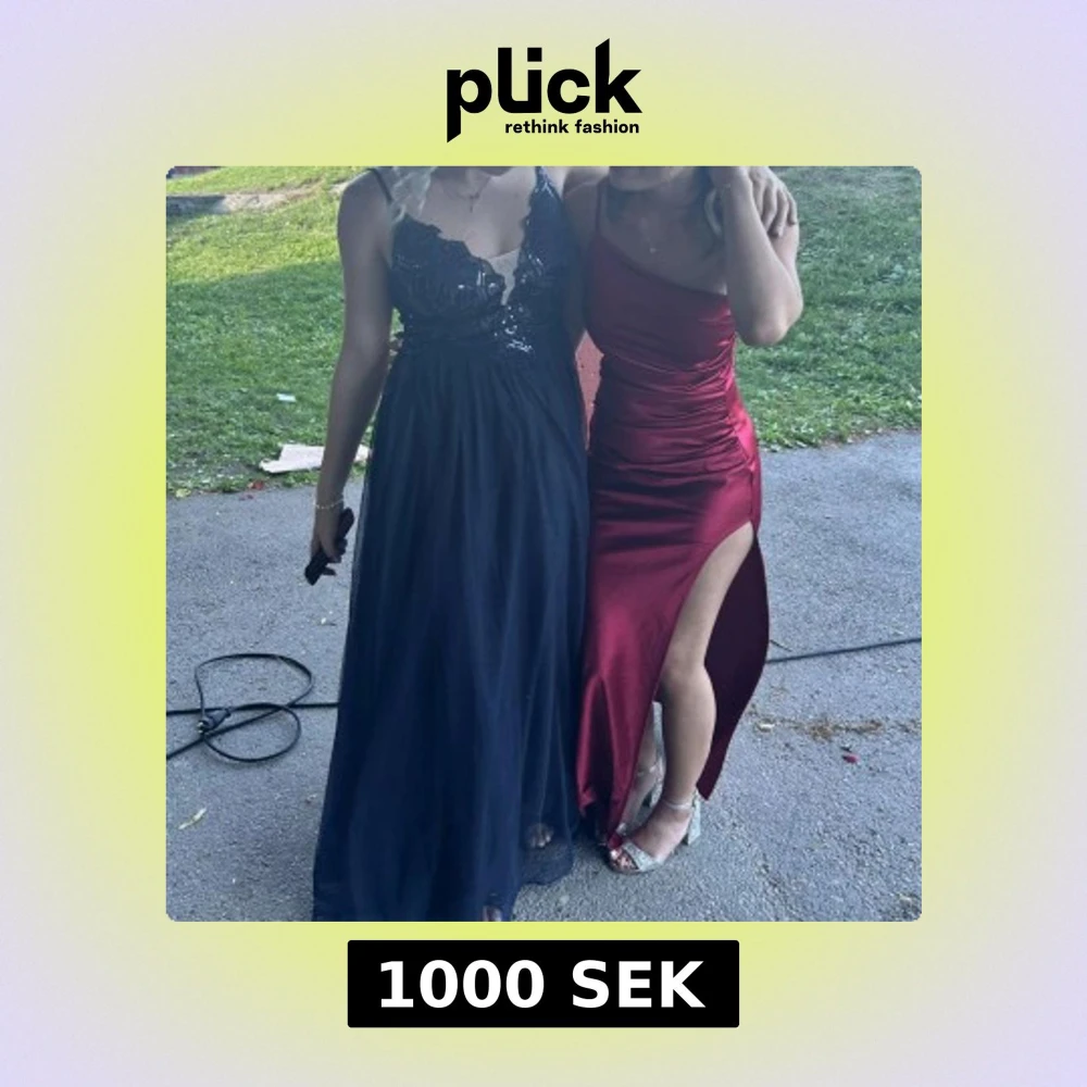 Säljer nu min fina mörkblåa klänning från JJ’s House. Den är dekorerad med paljetter, har djup v-ringning och är öppen i ryggen. Klänningen är gjord efter kroppsmått men skulle säga att det är storlek S