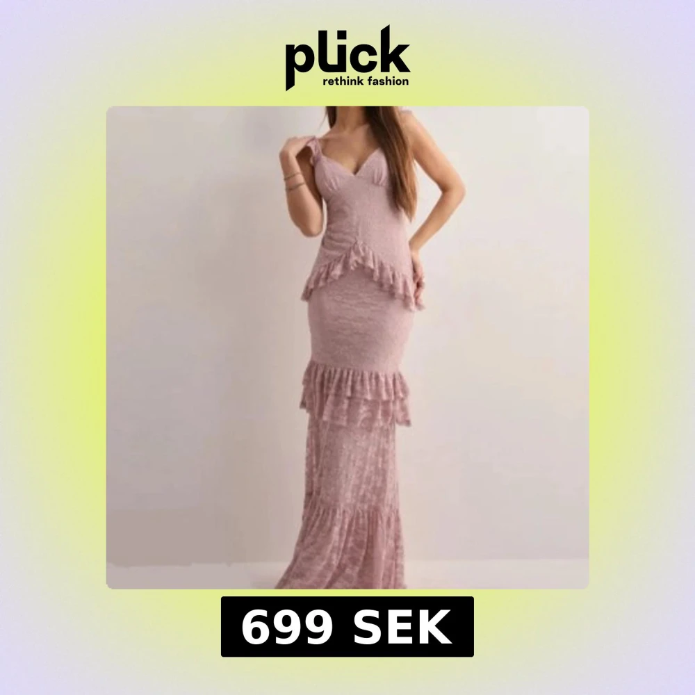 Supersöt långklänning i ljusrosa spets med volangdetaljer och v-ringning. Klänningen har smala axelband, öppen rygg med snörning och figurnära passform. Jätte fin till balen och använd endast en gång!🩷 nypris 899kr