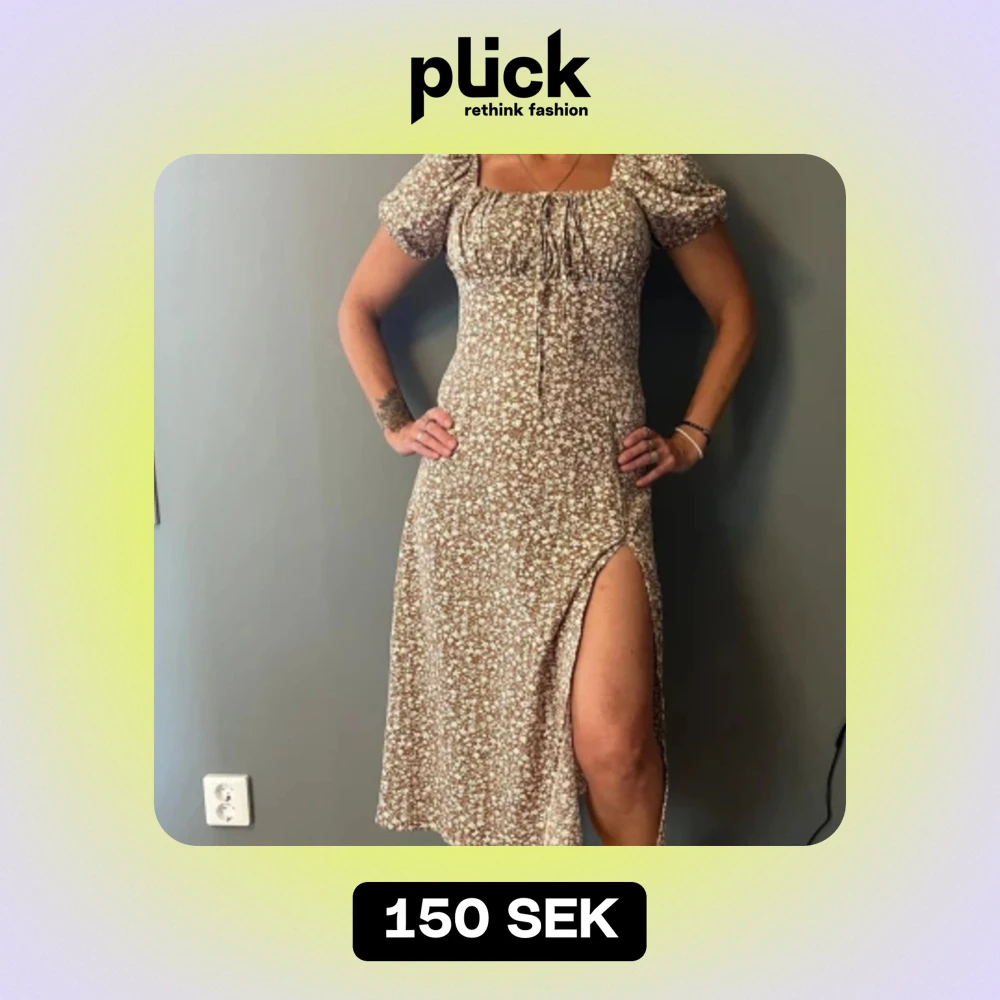 Beige blommig klänning i vacker passform med slits. Passar Stl S-M. Knappt använd.