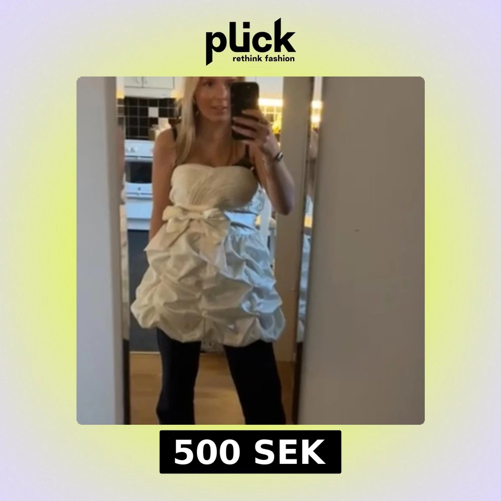 Säljer en vit kort klänning med axelbandslös design och stor rosett framtill. Klänningen har volangdetaljer och ett snyggt rynkat bakstycke. Materialet är glansigt och känns lyxigt, perfekt för dig som vill sticka ut med en unik look. Perfekt för studenten