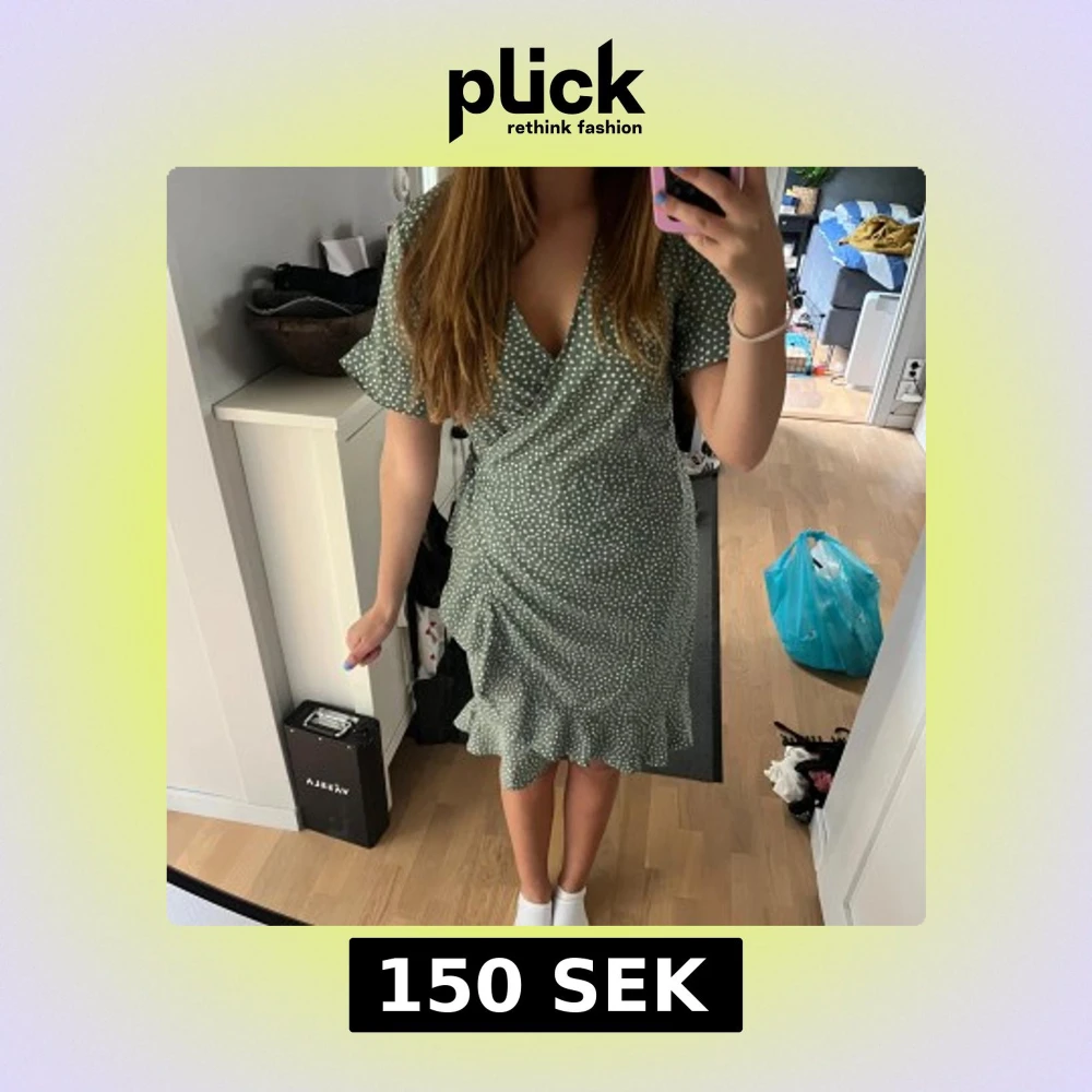 Säljer en superfin grön kort omlottklänning från Vero Moda med vita prickar. Klänningen har volangkant nertill, v-ringad hals och korta ärmar. Knyt i midjan för en snygg passform. Klänningen är i st S men skulle även passa M