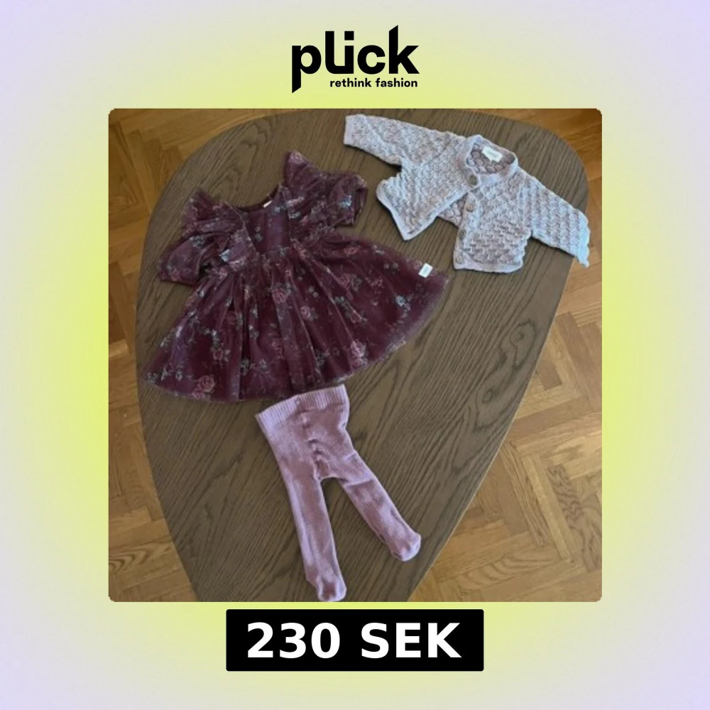 Superfin klänning från Newbie, använd bara en gång och är därför i princip i nyskick. ca 400kr nypris. Matchande strumpbyxor. En ljuslila glittrig kofta. Allt från Newbie i storlek 56. Fint skick.