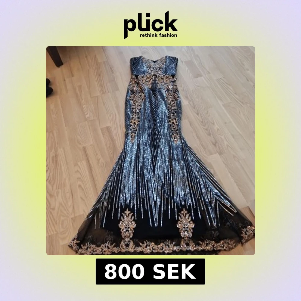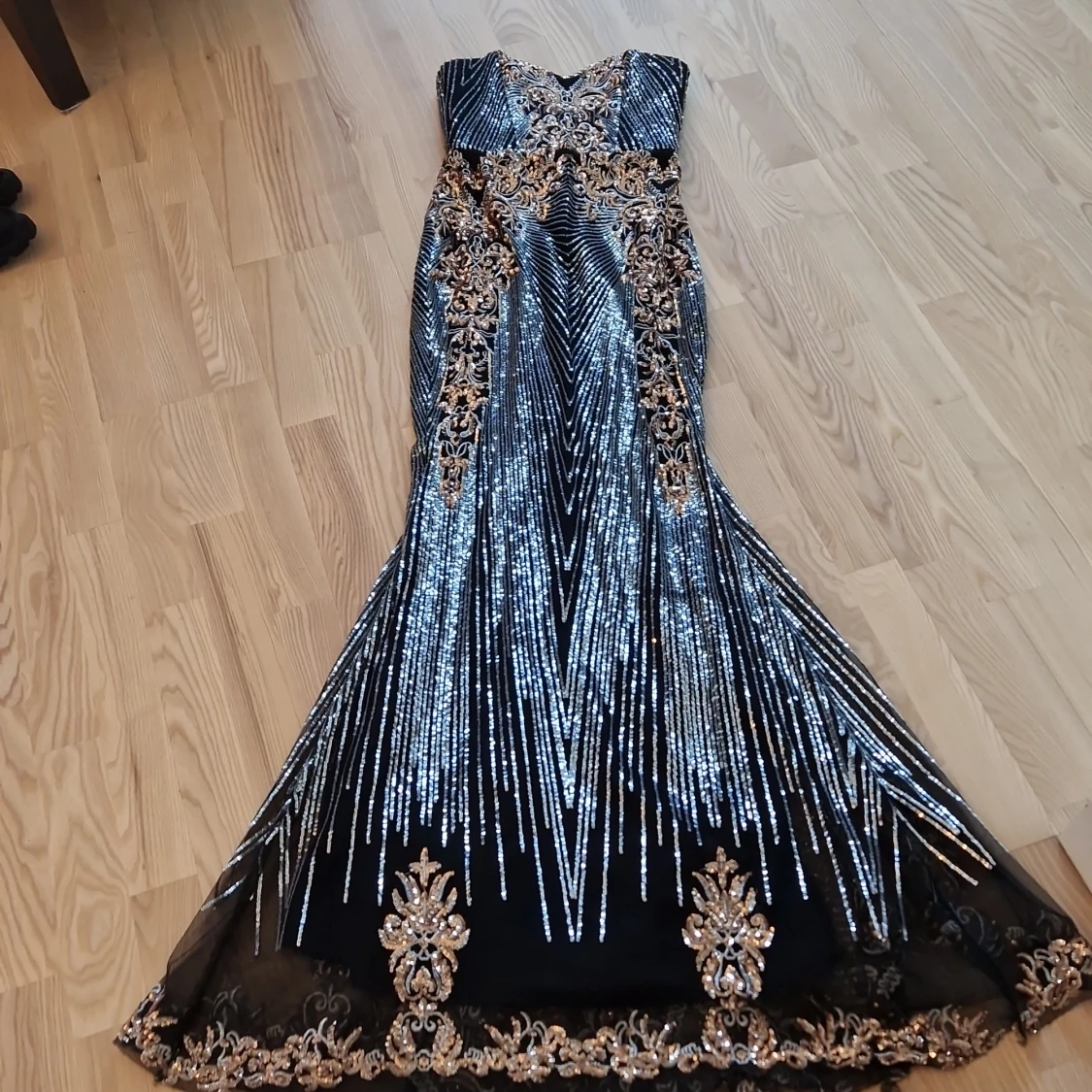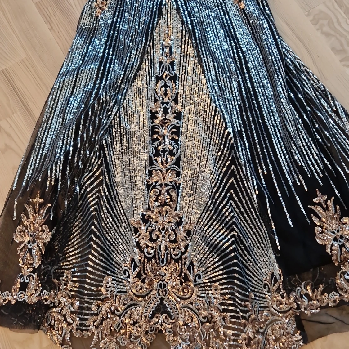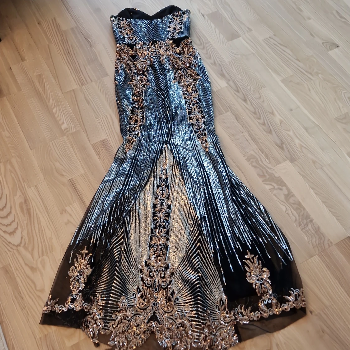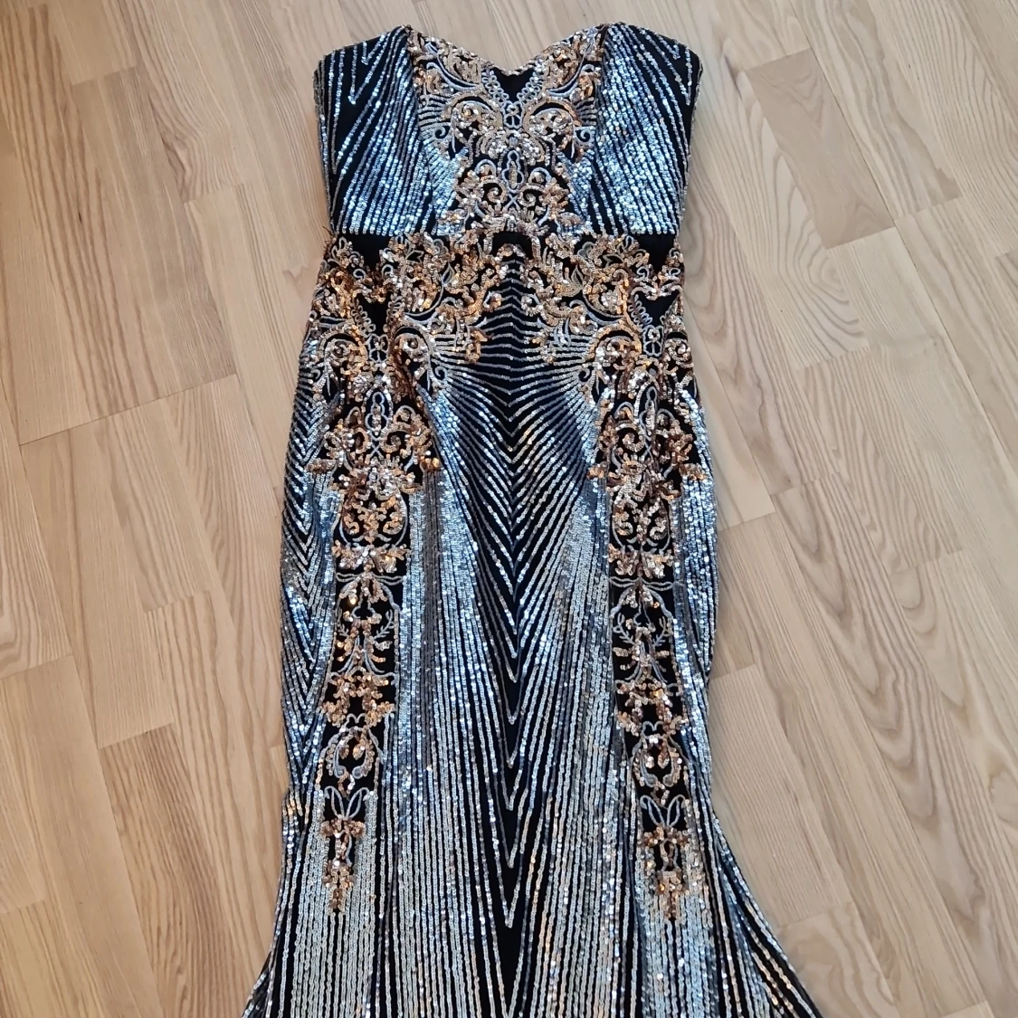 Fin armlösfest klänning med paljettdesign silver och kopparpaljetter på svart. Passar S-M. Använd bara 2 gånger.