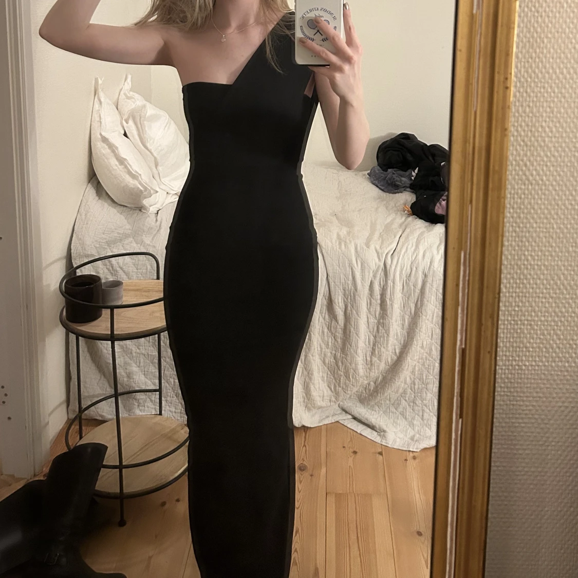 Säljer min balklänning som endast är använd en gång. Den är från PrettyLittleThing. Som en tubetopp upptill och en ärm på ena axeln (klänningen går runt bysten helt så ingen risk att något syns). Stretchig och sitter tajt. Sleeve nertill.
