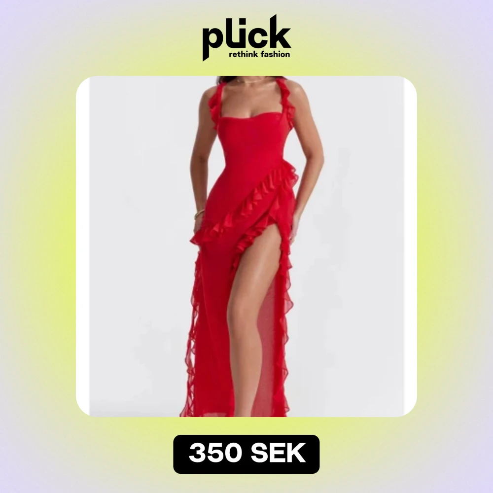 Drömmig och jätteskön röd klänning med volanger och slits! Alldrig använd då den var aningen för stor för mig. Köpare står för frakt. Skickar senast tre dagar efter beställning.