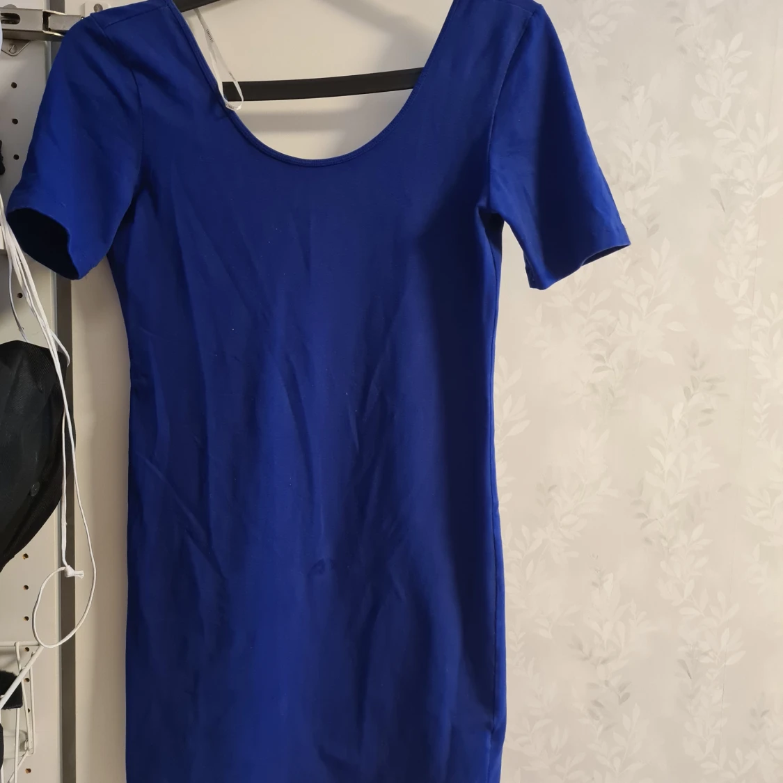 Blå fin klänning med u-ringad rygg som går till bh bandet. Är använd men har inga skador, den glittrar dock lite rosa efter en fest. Jag är 176 cm lång