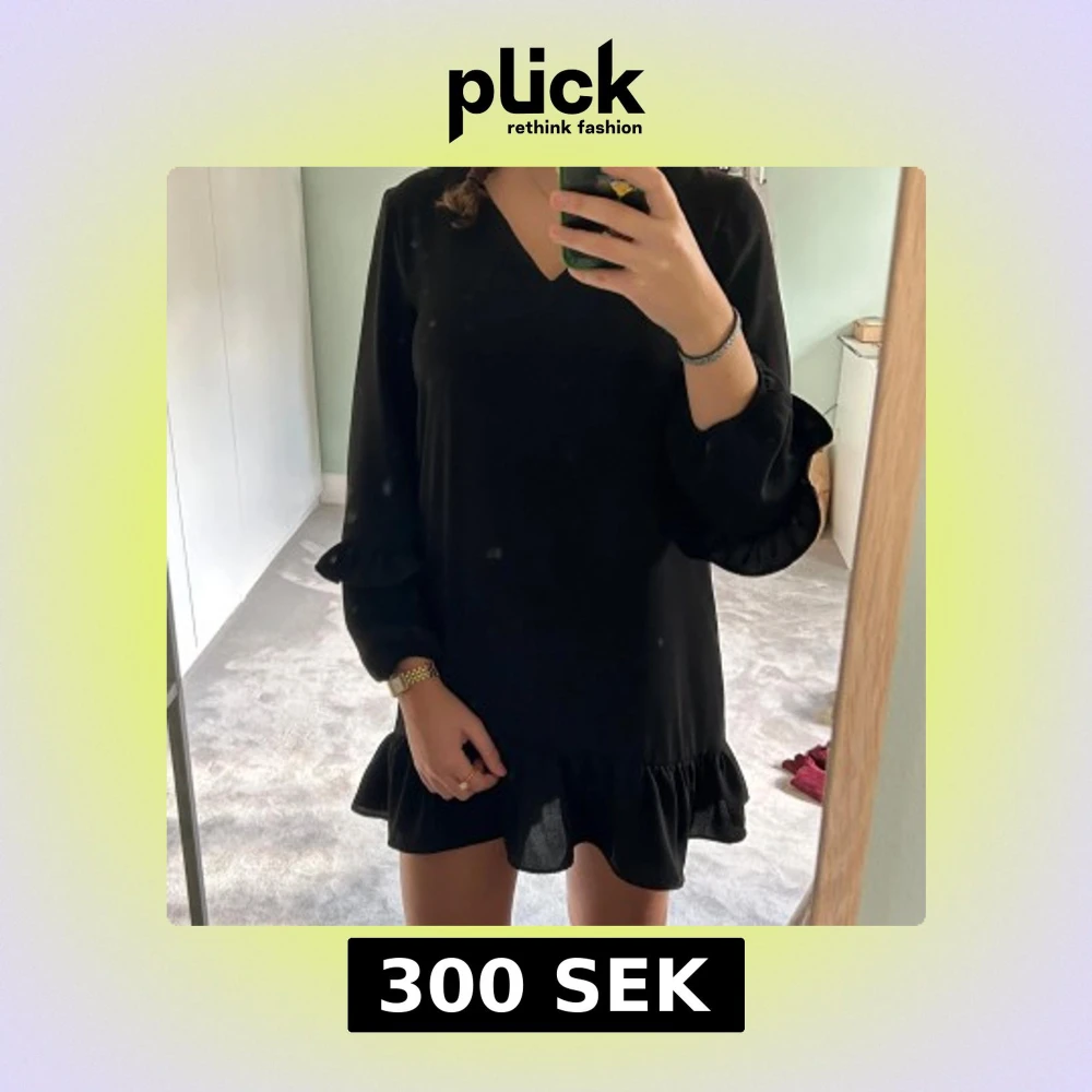 Supersöt svart kortklänning med v-ringning och volangdetaljer vid ärmslut och nederkant☀️ Långärmad modell med loose passform, perfekt för dig som gillar en stilren men ändå lekfull look💗💗