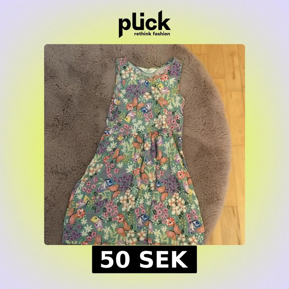 Superfin ärmlös klänning från H&M i storlek 134/140. Klänningen har en ljusgrön bas med färgglatt blommönster i rosa, lila, vitt och orange samt fjärilar.🦋