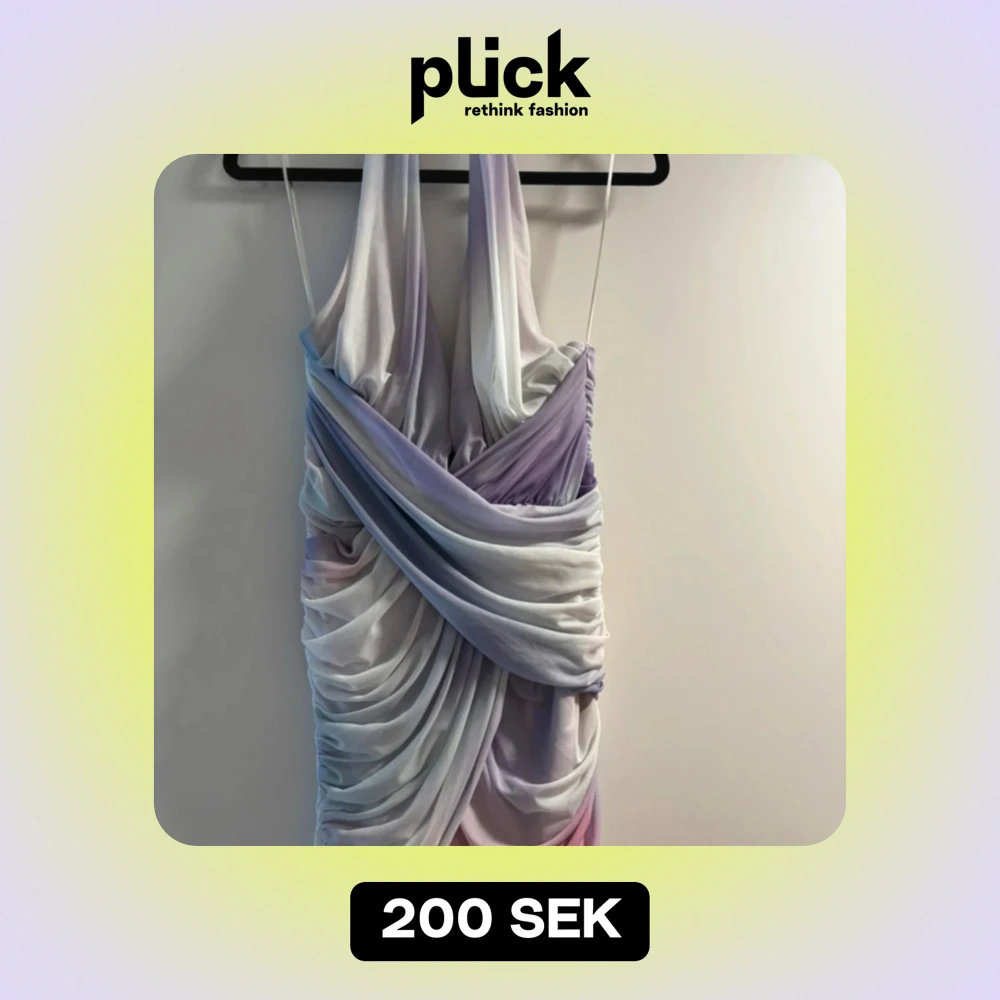 Säljer en superfin flerfärgad klänning med draperad design. Den har en vacker ombre-effekt i lila och rosa toner. Klänningen är ärmlös och har en elegant omlottstil framtill. Perfekt för sommarens fester eller en speciell kväll. Helt ny med tag kvar!