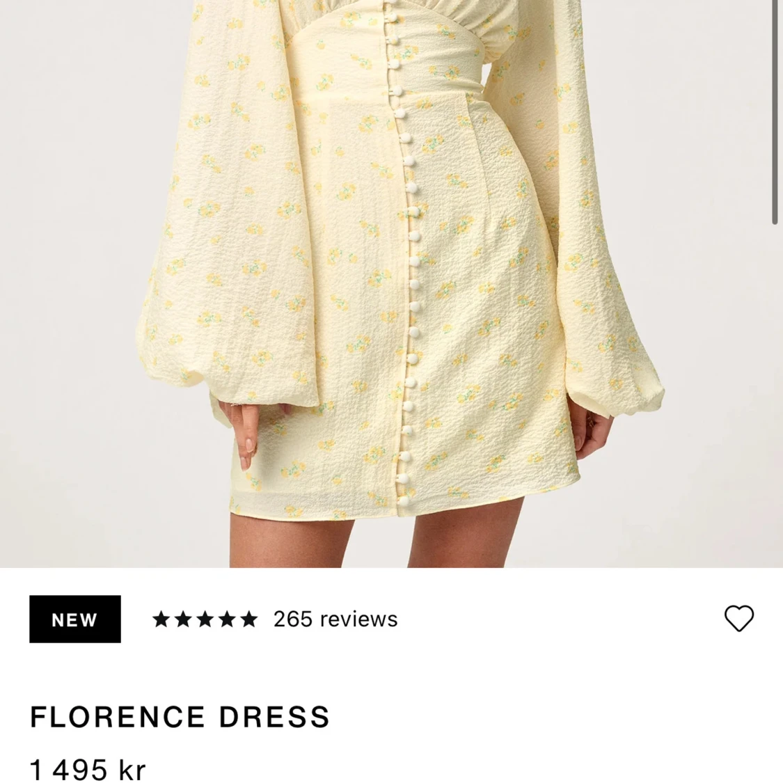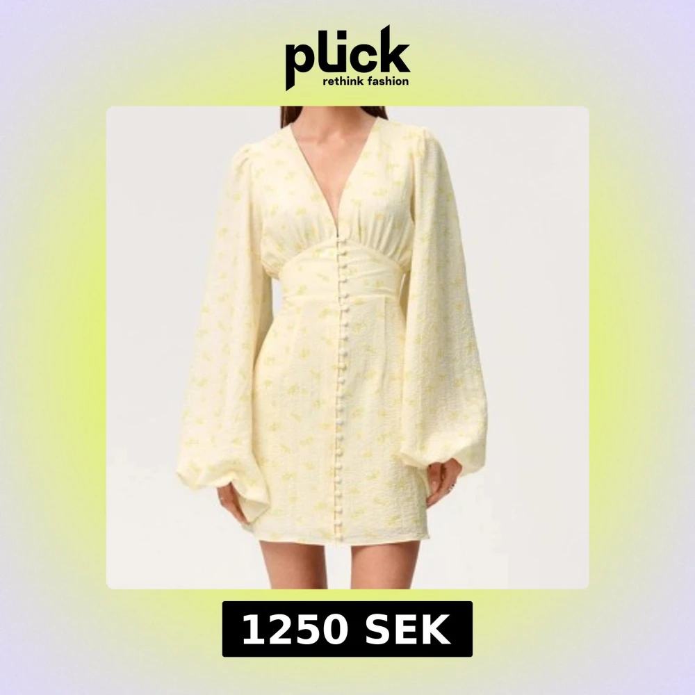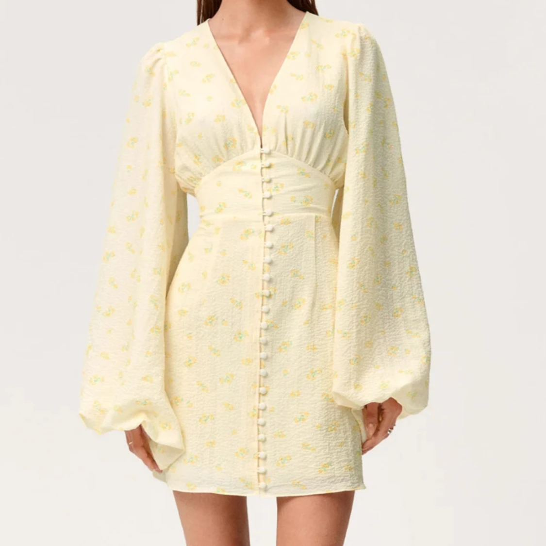 Superfin ljusgul kort klänning med små blommor, v-ringning och markerad midja. Klänningen har långa puffärmar och knappar framtill som ger en söt vintagekänsla. Perfekt för sommarens alla tillfällen!