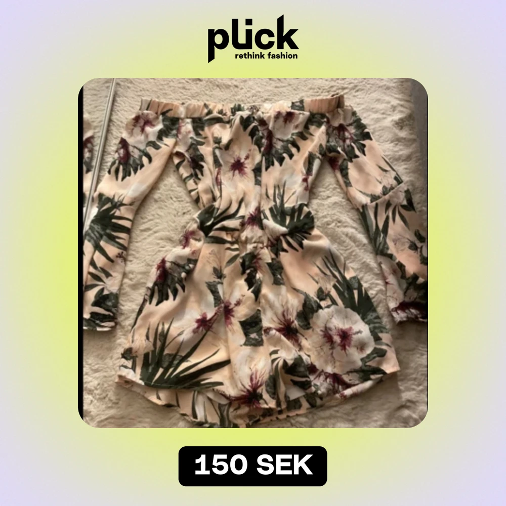 den är jätte pösig/ luftig och hade passat perfekt utomlands de har insydda shorts och två fickor den är off shoulder och är i bra skick storlek 36 EU