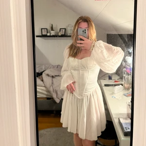 Jättefin vit korsett klänning från missord, med fluffiga och flowiga ärmar! Säljer då de inte kommer till användning, helt ny med lapp kvar🤝 nypris 399kr