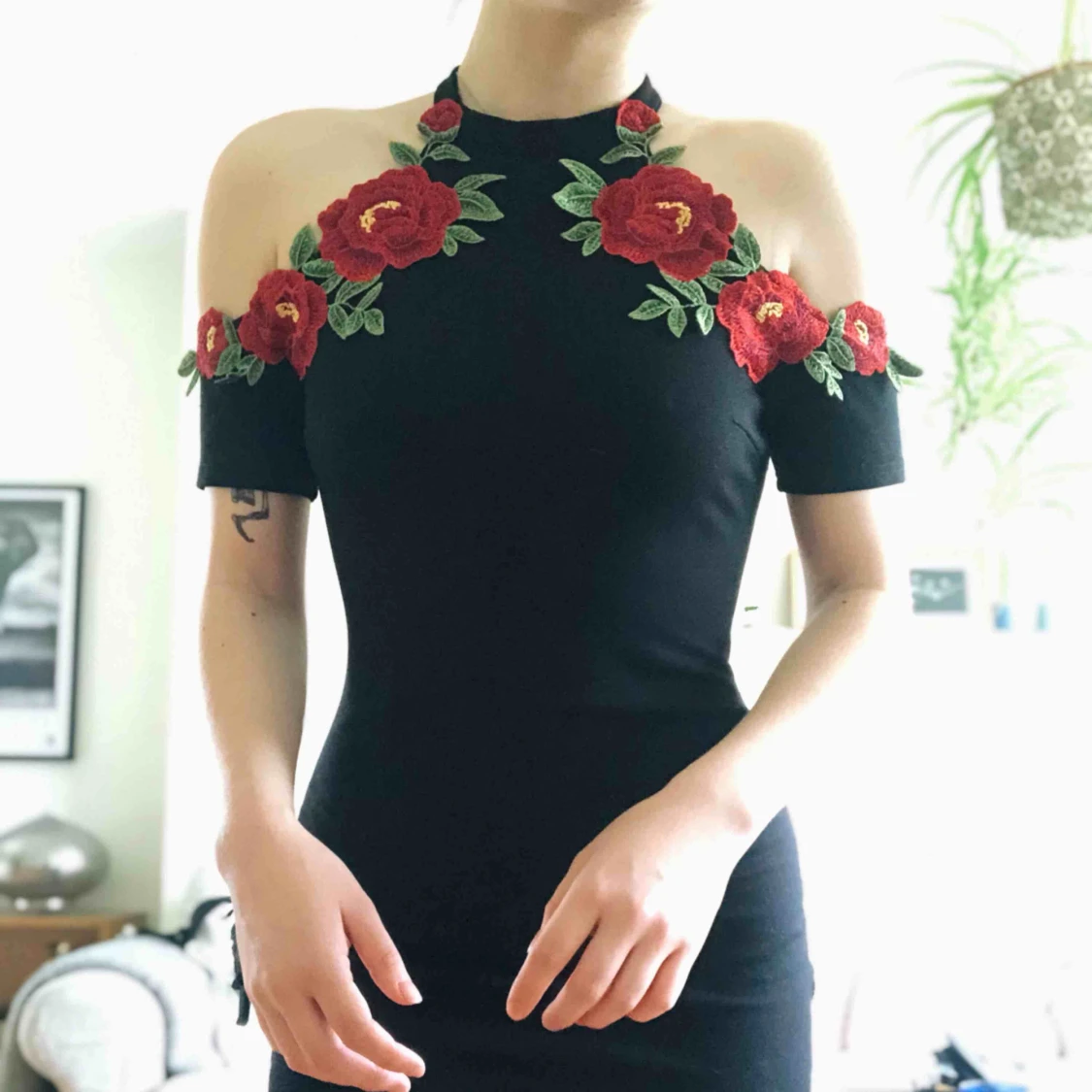 Supersöt kort klänning med broderade blommor pch bara axlar. Den är i storlek M, men kan tänka mig att den skulle passa S också. Bara använd en gång, så den är i princip i nyskick. Frakt på 30kr tillkommer! 💖💖💖