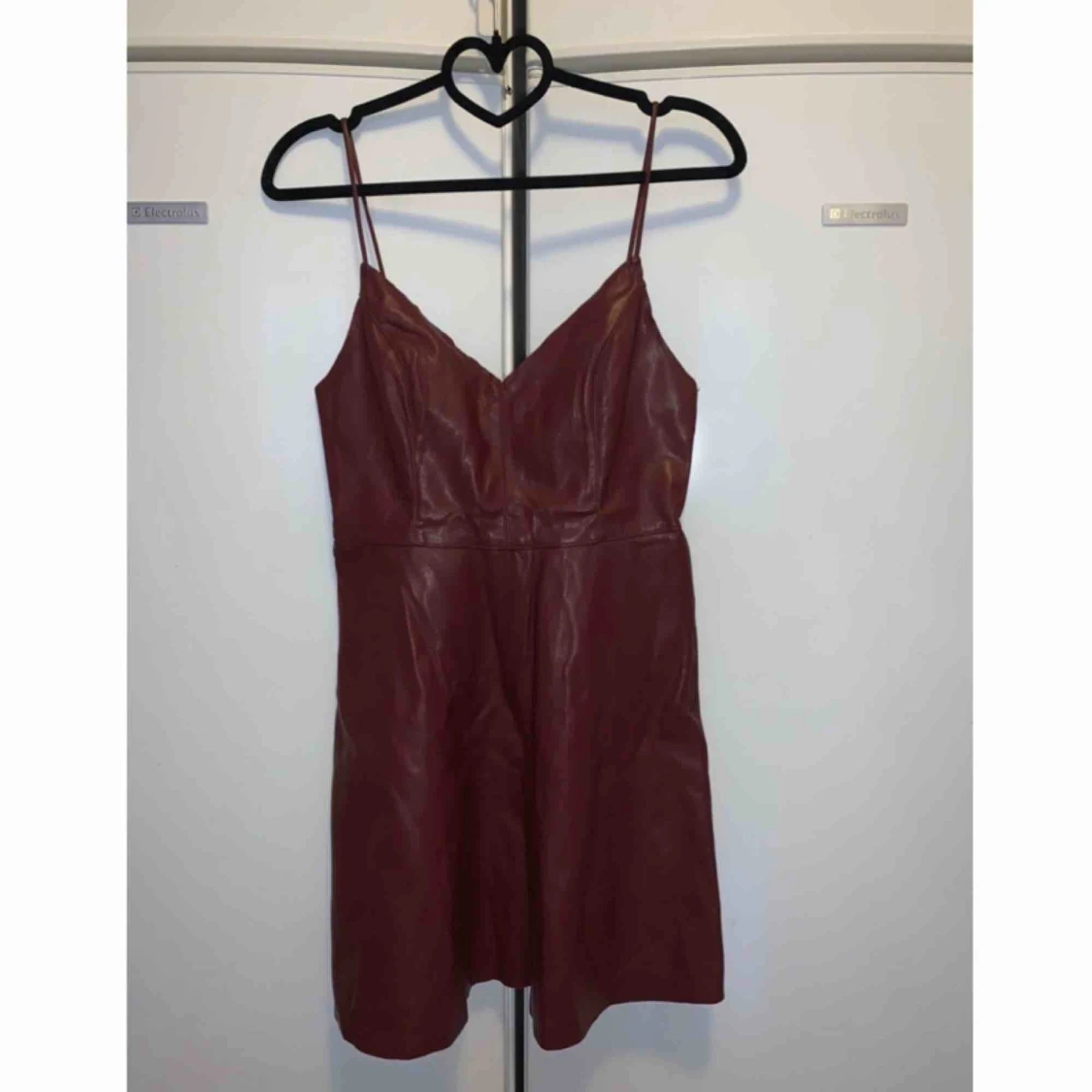 Vinröd konstläders klänning i strl S. Aldrig använd och är ny. Frakt tillkommer med 63 kr och samfraktar gärna.