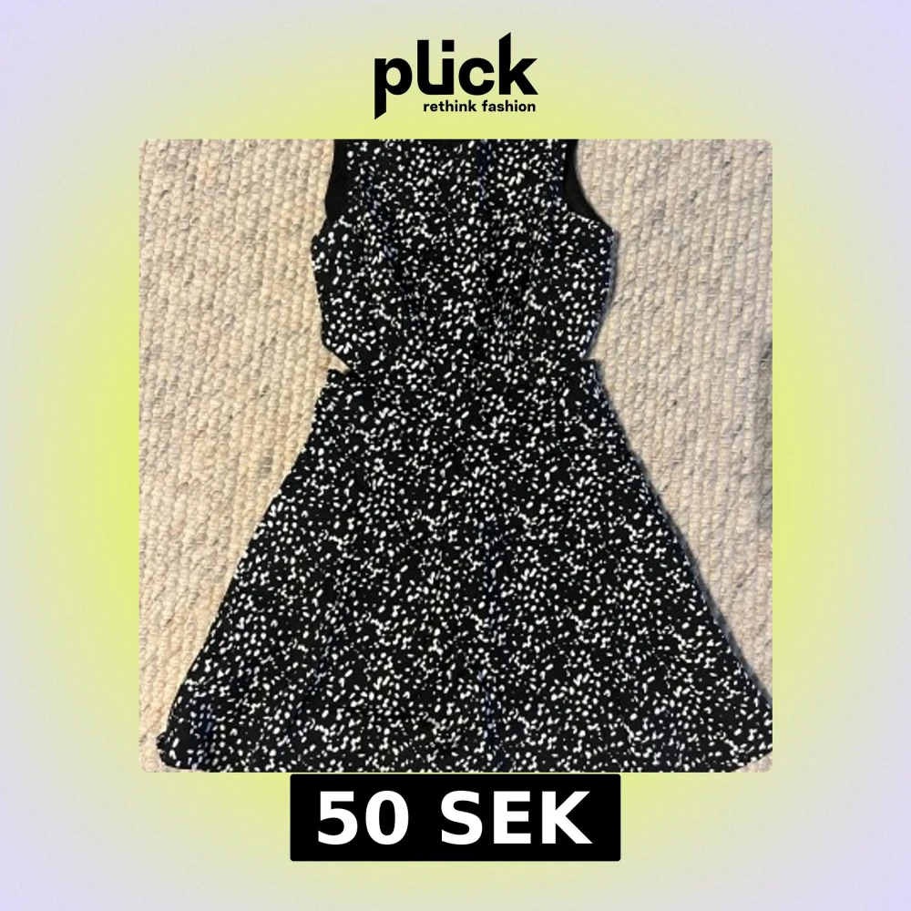 Säljer en svart ärmlös klänning från Forever 21 med vitt prickigt mönster. Klänningen har en rund halsringning och dragkedja i ryggen. Kjolen är lätt utsvängd.