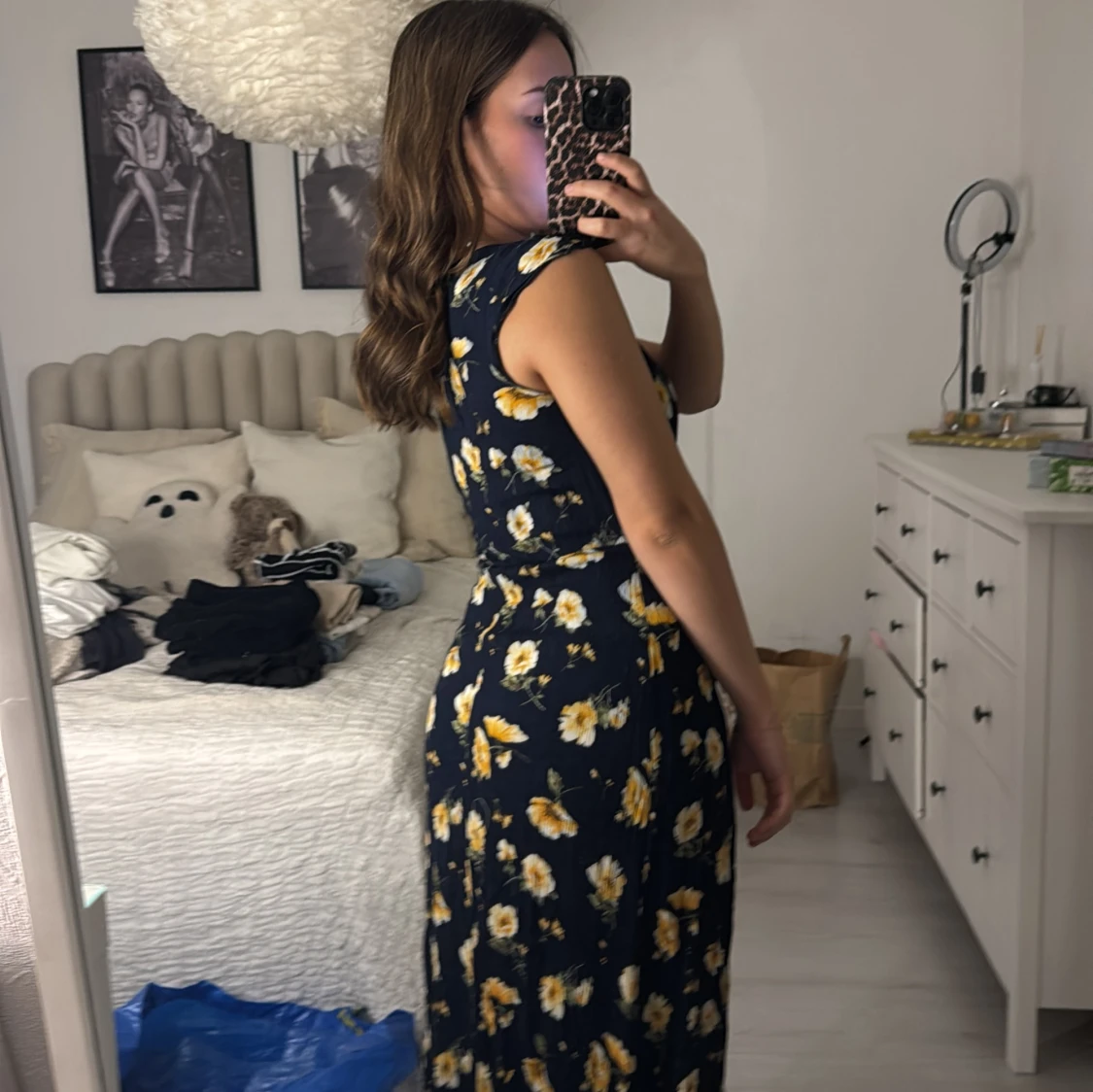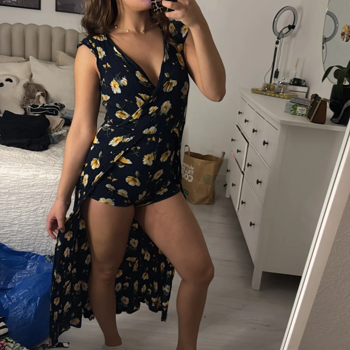 Säljer en superfin blommig omlottklänning i mörkblått med gula och vita blommor. Klänningen har en v-ringad design och en slits som ger en snygg look. Perfekt för sommarens fester eller en dag på stan. Den är i mycket bra skick och passar perfekt för en avslappnad men stilren outfit.