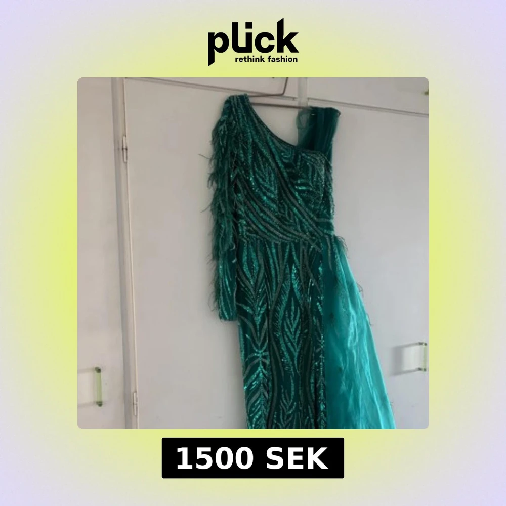 Säljer en turkos långklänning med ett glittrigt paljettmönster och fjäderdetaljer på ena axeln. Klänningen har oneshoulder-skärning och en elegant släp i tunt tyg. Helt oanvänd med etikett på! Köpt från Turkiet. Passar någon i storleken 36/38! Pris går att diskutera