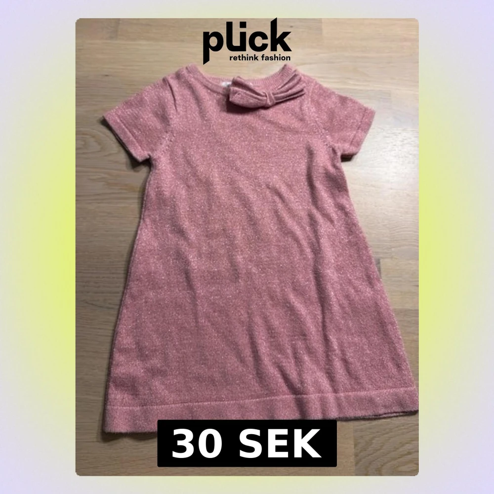 Supersöt rosa kortklänning från H&M med glittriga inslag och en dekorativ rosett vid halsen. Klänningen har korta ärmar och är gjord i ett mjukt, stretchigt material som känns bekvämt hela dagen.
