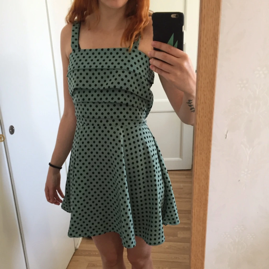 Supergullig klänning från Fröken Söt. Blankt satin-aktigt tyg med fint fall. Tyvärr så har sömmen i sidan gått upp lite (se bild) men det går lätt at fixa för den som är lite händig.