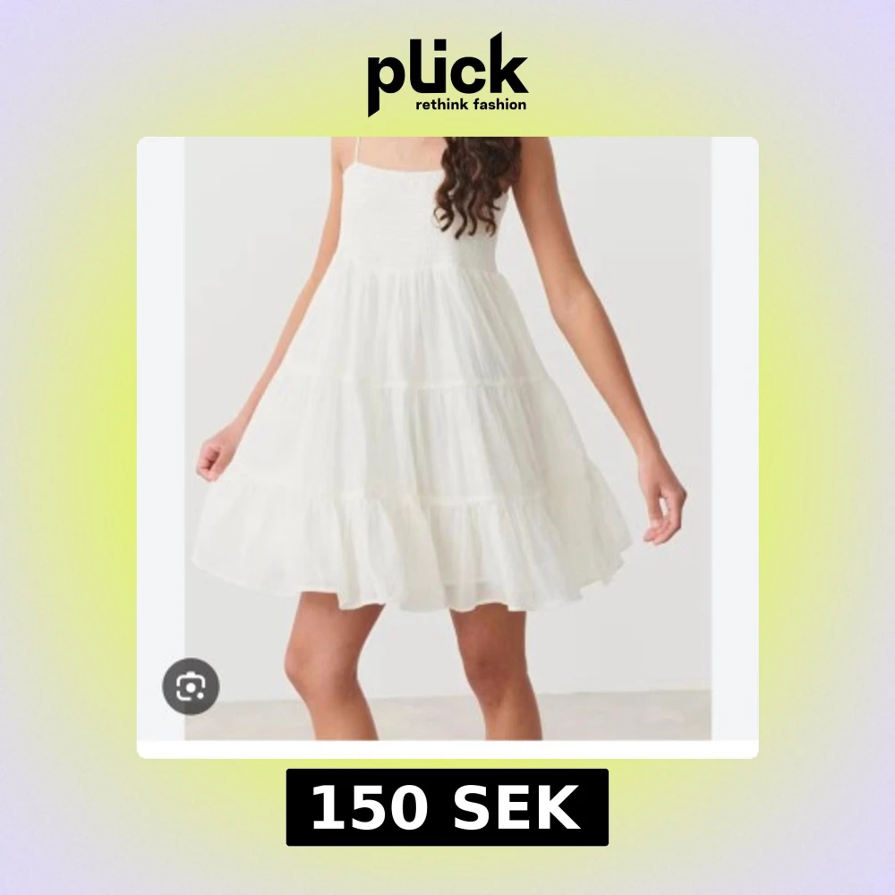 Söt vit klänning med smala axelband och volangdetaljer. Perfekt för varma sommardagar med sin luftiga design och korta längd. Den har en smockad överdel som ger en bekväm passform. Från Gina endast andvänd en gång
