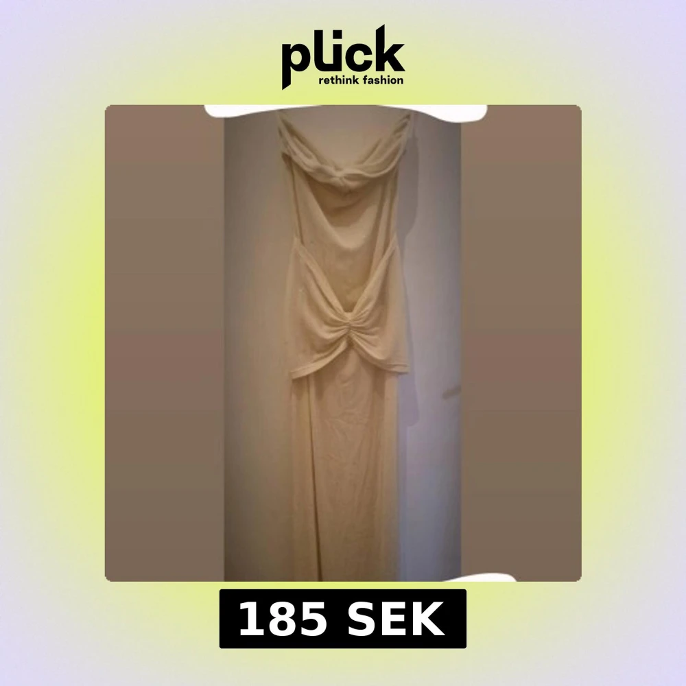 Supersnygg långklänning i champagnefärg med glittriga detaljer. Klänningen är axelbandslös, tunt transparent material men extra typ vid brösten och där nere som ni kan se på bilden. Den är S men passar M oxå. (om man har små bröst så är den nog enkel att åka mer om man inte använder dubbelhäftande hud-tejp under, bara så ni vet liksom)
