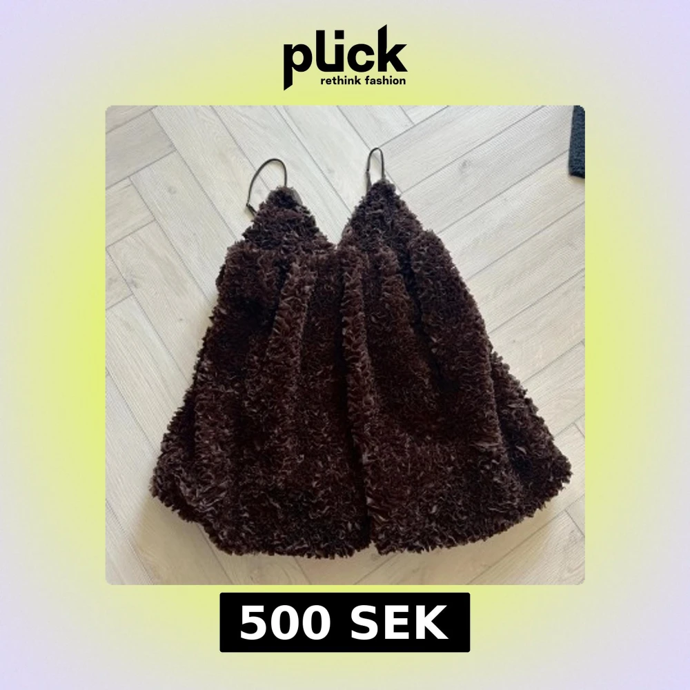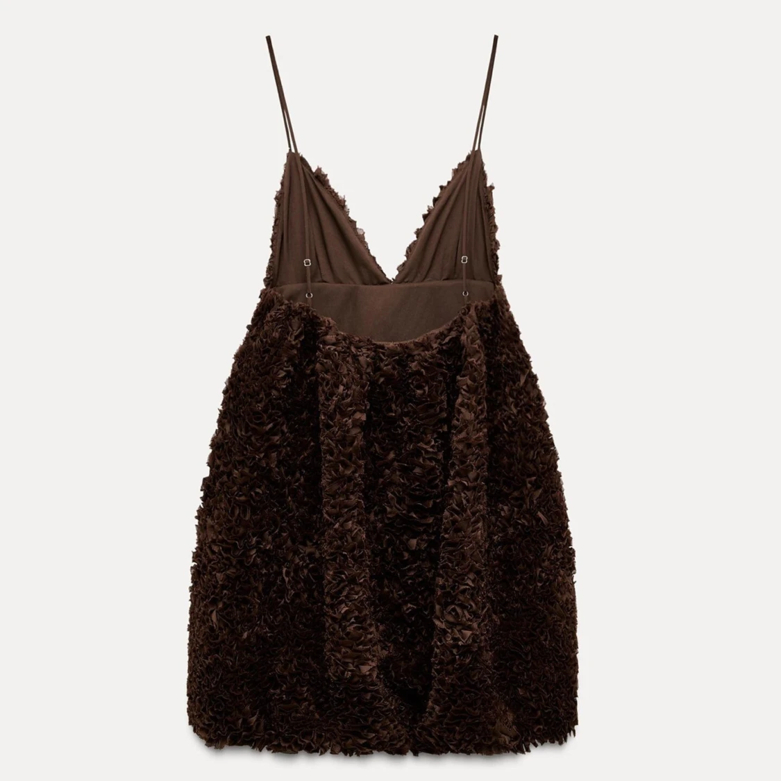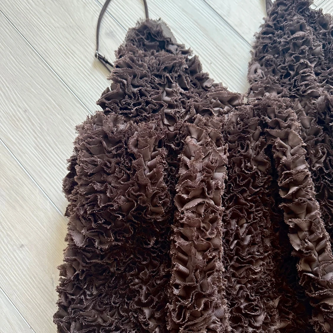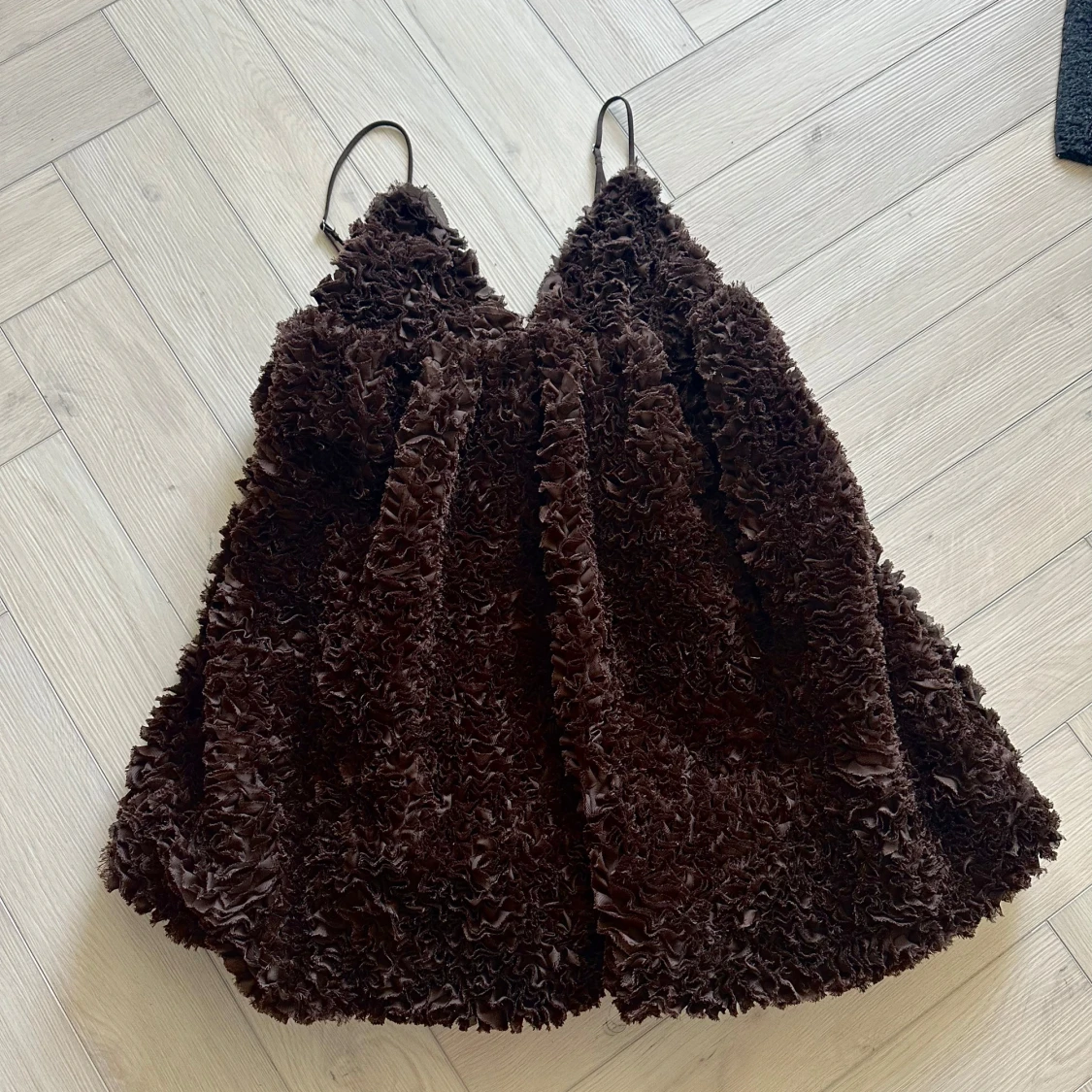 Säljer en unik brun klänning med volangdetaljer och tunna axelband. Testad men inte använd. Perfekt för en speciell kväll med sin texturerade look och eleganta design.