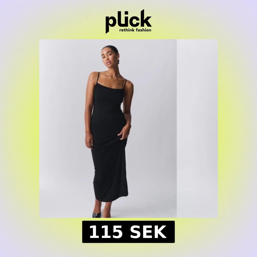 En stilren svart långklänning med smala axelband och figurnära passform. Klänningen har en enkel och elegant design som passar perfekt till festliga tillfällen. Materialet ser mjukt och följsamt ut.