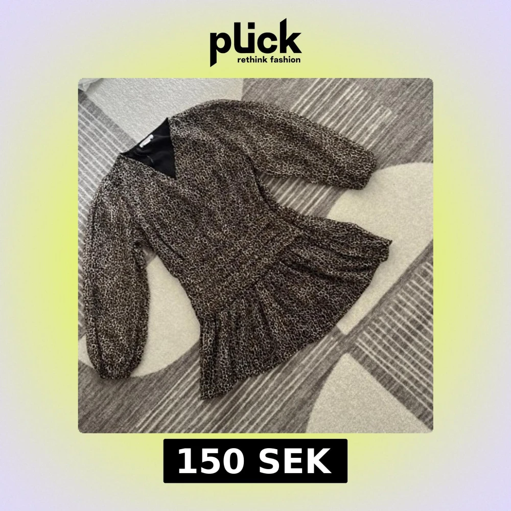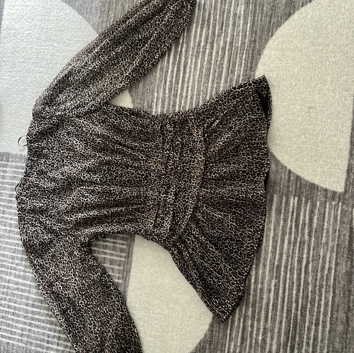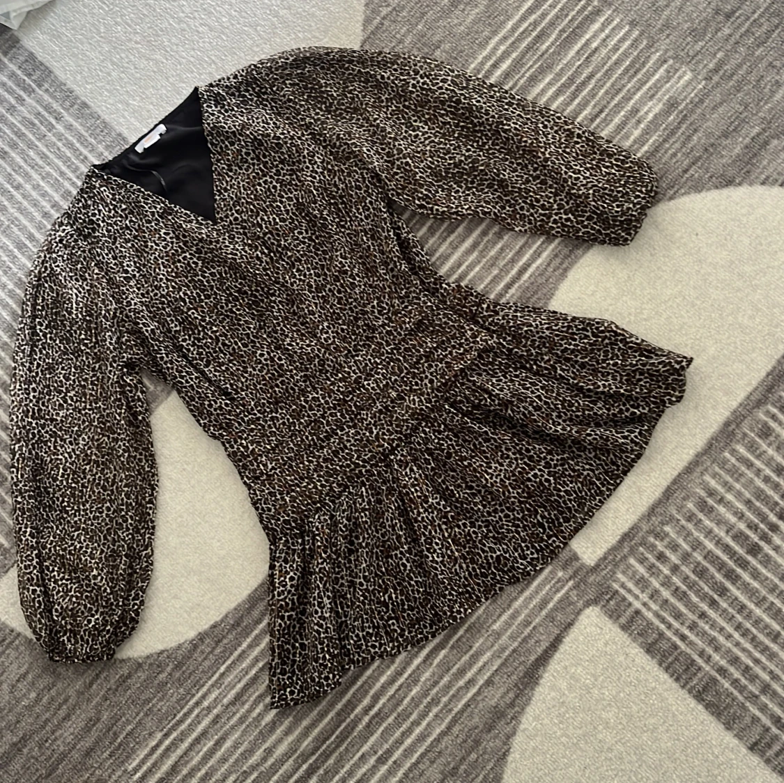 Säljer en kort klänning med leopardmönster och volang nertill. Klänningen har långärmade puffärmar, markerad midja och v-ringad hals. Färgerna går i svart, beige och brunt. Perfekt för dig som vill sticka ut med en trendig look.