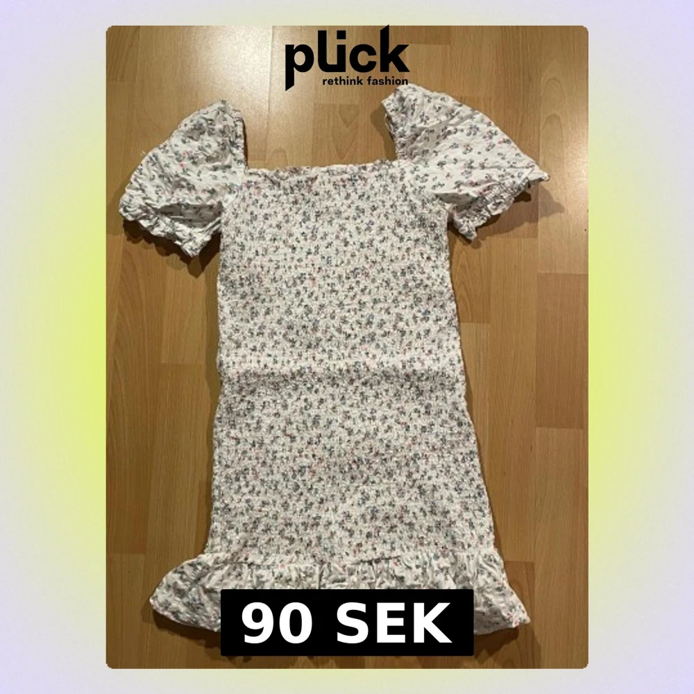 Vit kortklänning med små blommor. Klänningen har puffiga kortärmar, smockad kropp och volangkant nedtill.