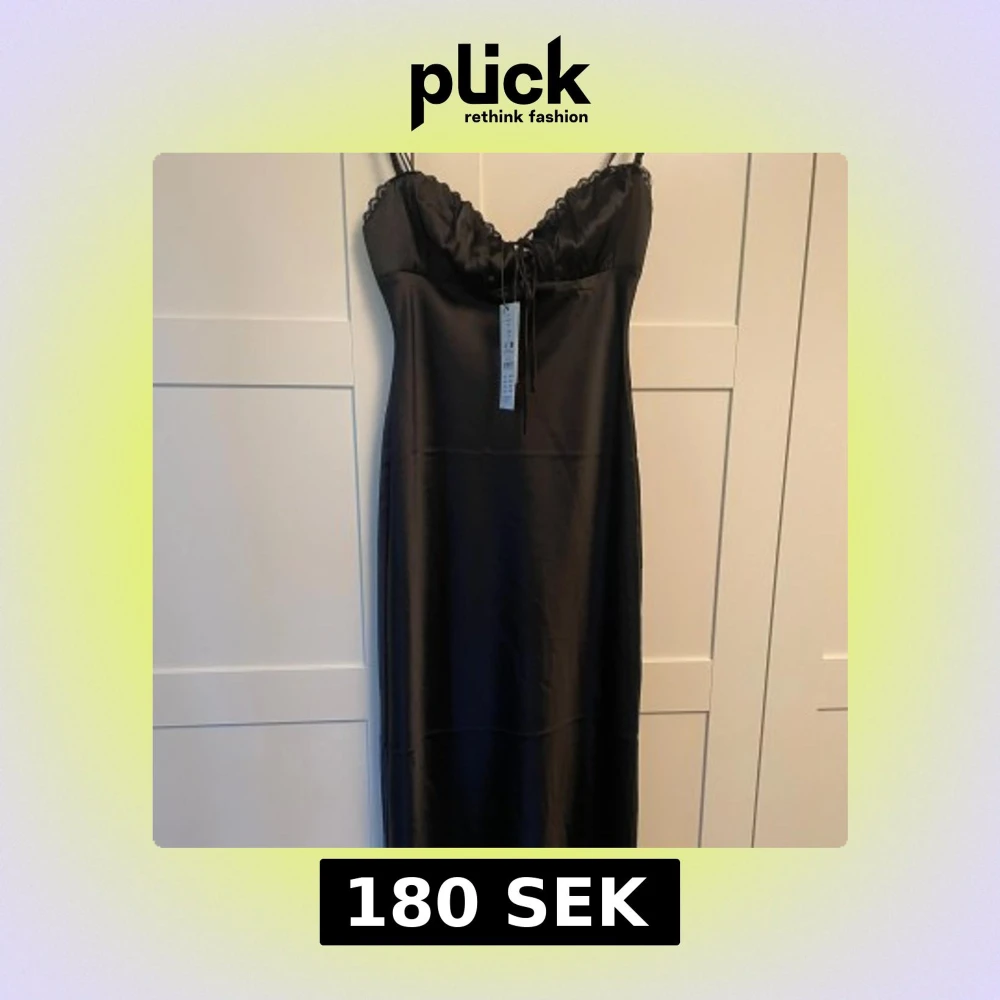Supersnygg svart långklänning från Gina i satin med tunna axelband och spetskant vid bysten. Klänningen är enbart provad och i storlek 34! Nypris 499kr